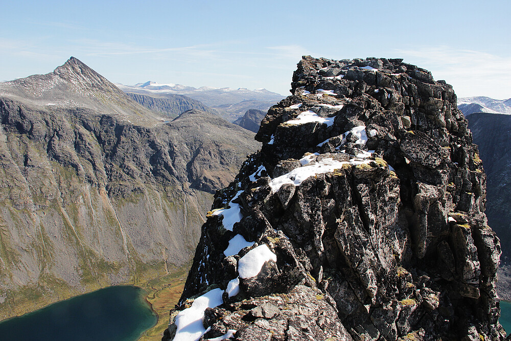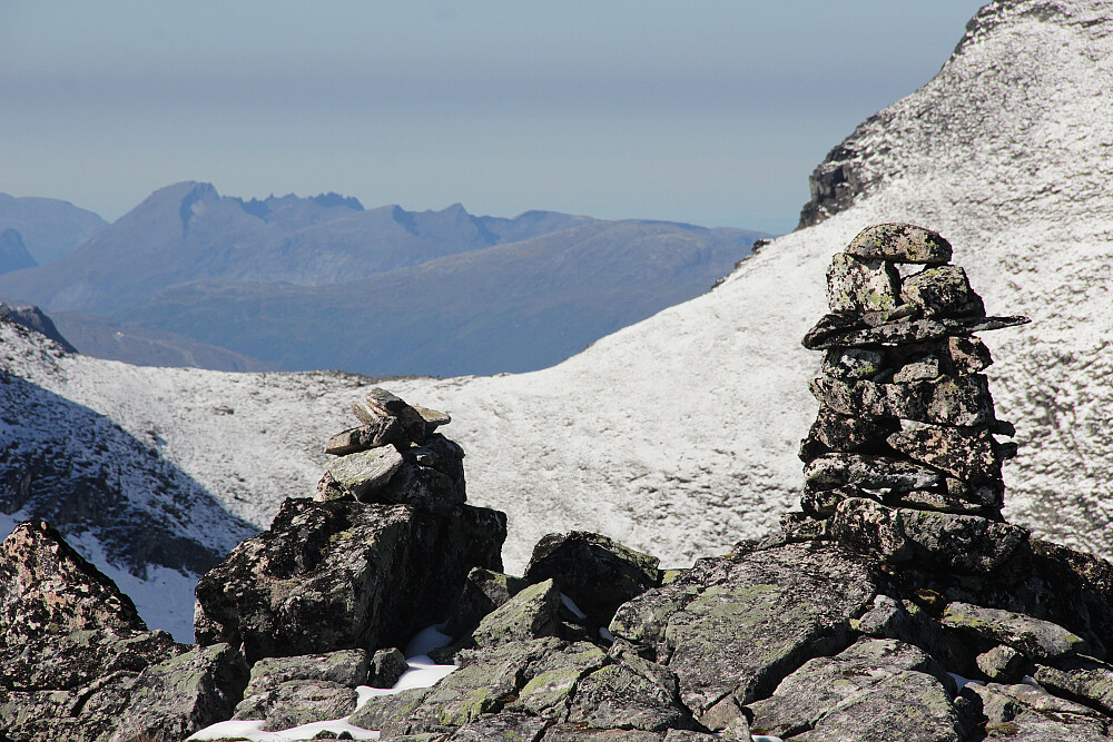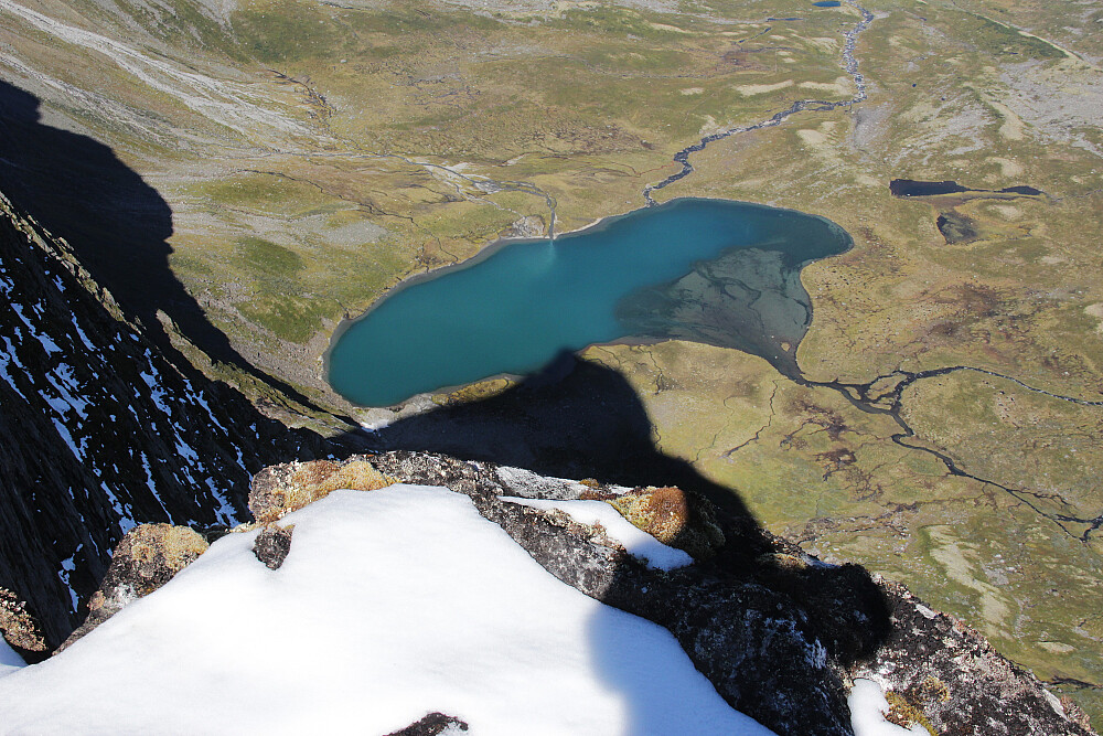 Fortsatt nysnø igjen på fortoppen. Litlevatnet under.