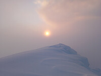 Mye tåke i skiktet mellom lavland og fjell. Mye sol over det. Etterhvert lurte tåka litt rundt toppen også. Spennende lys og svært godt føre.