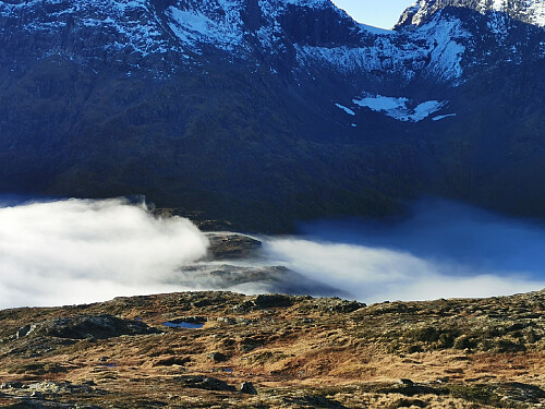 Siden eldstedatteren skulle hentes i Lofthus, dro jeg inn dagen i forveien. Booket rom på Trolltunga camping og kjørte etter en god natts søvn ut til Eikhamrane. Parkerte nær buss- stoppet og gikk opp forbi husene. Stien var ikke lett å følge i starten og jeg mistet den raskt. Men fulgte logisk retning og fant den igjen rundt 100 hm lengre oppe. Deretter var den grei å følge opp det bratteste partiet og bort til en gammel hytte på 343 moh. Videre var det igjen noe vanskelig, men jeg visste at jeg skulle opp på Nosi, så fant stien igjen med en gang det ble smalt og bratt. Nå kom jeg inn i skydekket og sikten var ikke mange meterne. Men i det jeg passerte Nosi, begynte det så smått å lysne og på rundt 850 moh kom jeg opp i strålende sol!