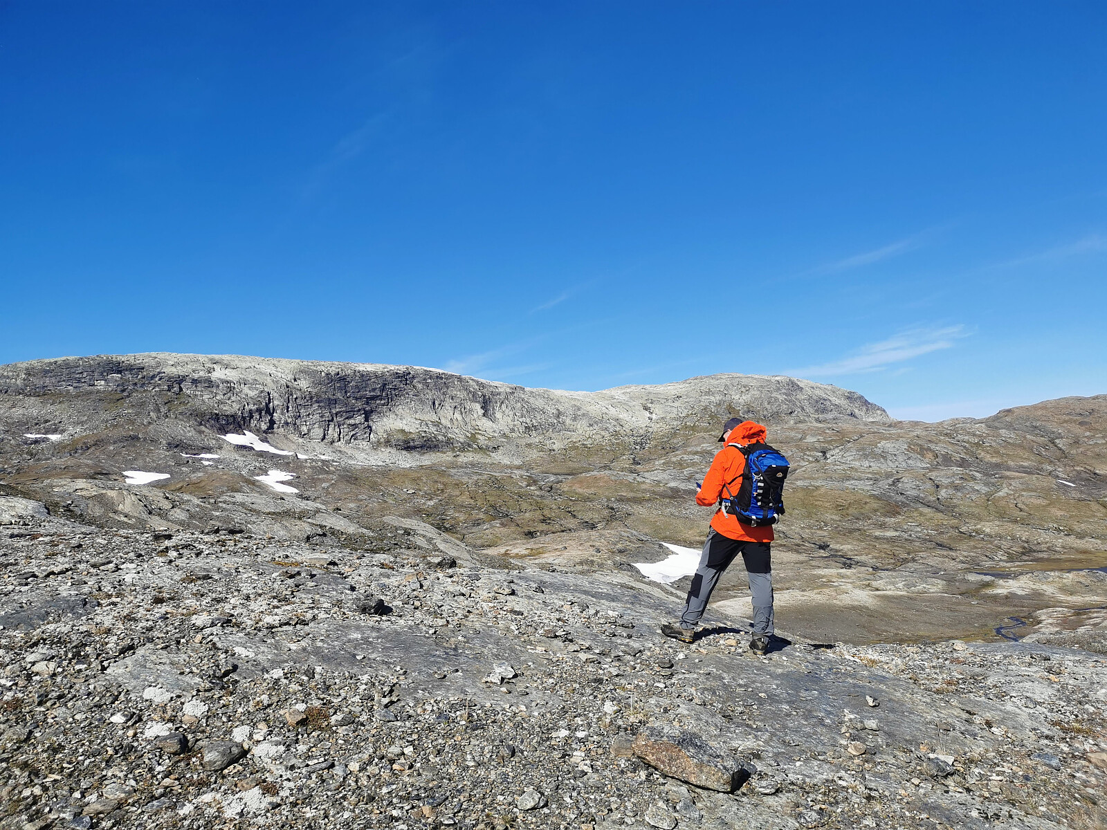 Kompis Harald og jeg våknet opp til nok en nydelig dag på Finse, godt fornøyd med gårsdagens tur til Storetunga. Vi fikk oss en god frokost på Finsehytta og la i vei oppover T-stien mot Geiteryggshytta litt over halv ni. Etter tre kilometer tok vi av mot NV og fulgte dalføret i lettgått terreng opp til det høyeste punktet på rundt 1530 moh. Deretter bar det ned i Såtedalen som ligger rundt 150 hm lavere. Vi tok sikte på å gå rett opp fjellsiden øst for toppen. Dette viste seg å være helt problemfritt, med kun litt enkel klyving noen steder, men man må velge riktig rute. Ankom toppen etter 4 timer på tur og nå var det skyet litt over, så vi ble ikke lenge her oppe. Tok oss ned igjen mot Såtedalen og hadde en god lunsj et stykke oppe i bakkene.