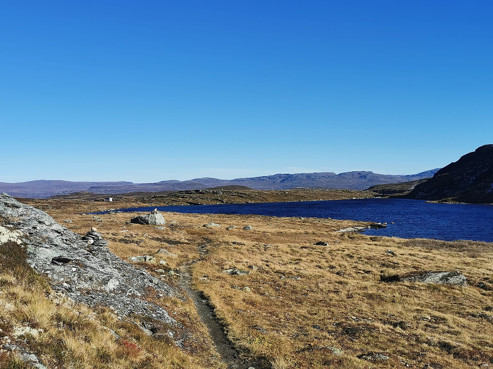 Årets siste tur på Hardangervidda ble lagt til de få toppene jeg hadde igjen i norvest. Parkerte bilen på Hjølmo lørdag morgen og la i vei på DNT stien til Vivelid. Deretter var det på umerket, men tydelig sti på nedsiden av Rundenuten og opp på Kongsbergnuten. Stien opp var noe bløt, men det ble en flott tur videre oppe på selve fjellet. Etter 1t 45 min hadde jeg en kort lunsjpause i le fra den kraftige østavinden oppe på fjellet. En time senere nådde jeg stikrysset midt oppe på Nuhaugane (Vivelid-Hedlo-Hadlaskard-Finnabu). Her la jeg fra meg sekken og gikk den siste halvannen kilometeren bort på selve topp-punktet. Fin utsikt ned i Veigdalen og mot Hadlaskard, men det var vindfullt, så det ble med et par bilder før jeg returnerte tilbake nesten samme vei. Videre var det ca 4 km med litt opp og ned før jeg ankom Finnabu. Her ble det en god hvil og en matbit med kaffe.