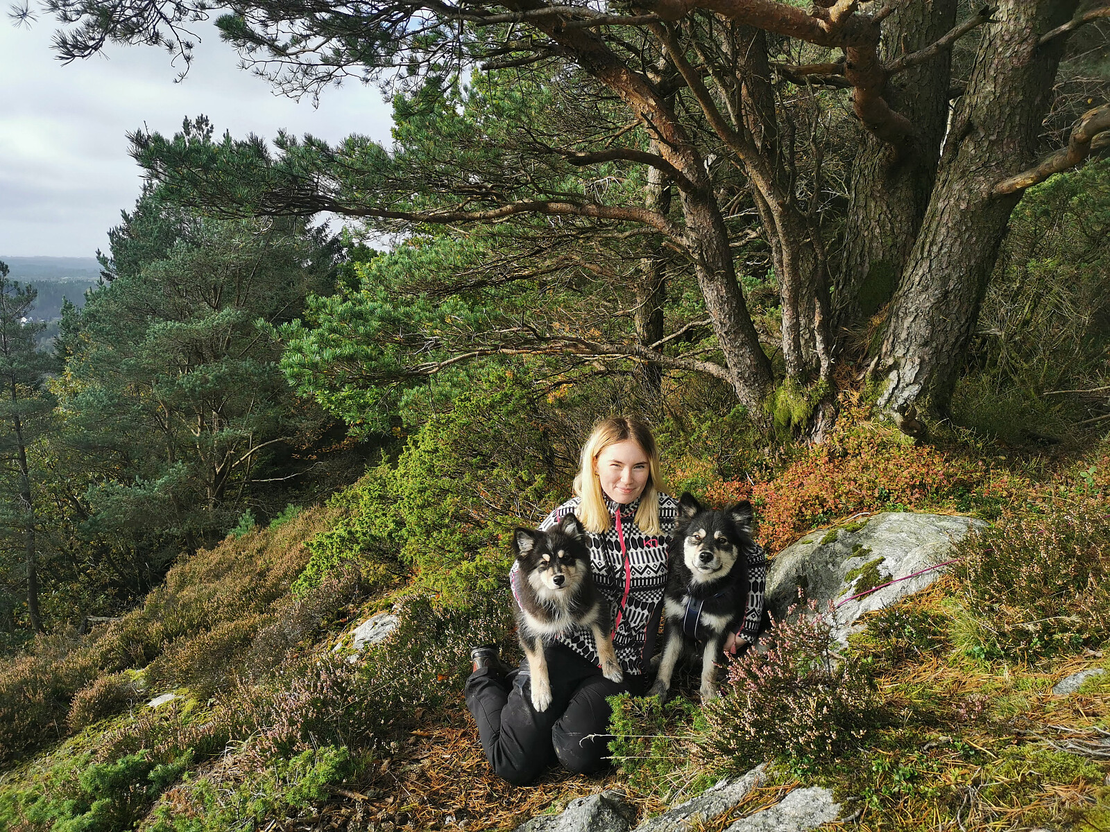 Kombinerte lærekjøring med en liten skogstur og hadde derfor med meg eldstejenta og begge hundene denne søndagen. Vi fulgte litt forskjellige stier i skogen og kom oss til slutt opp til toppen. Og, ja det var noe kronglete terreng med mange rotvelt. Utsikten var heller ikke formidabel. Stoppet for kaffe og kjeks ved Hellestveitnøve torvhytte og nøt litt solgløtt, før vi returnerte til bilen.