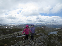 Jentene var superflinke og vi kom oss opp de bratte 450 høydemeterne på 1t 45 minutter. En flott utsikt i de fleste retninger, spesielt ut fjorden. Været var lettskyet, men det lurte noen regnbyger i nærheten, så vi ble ikke lenge på toppen. På veien tilbake gikk vi (selvsagt) innom topp punket litt øst for varden. Turen ned igjen gikk fint, men vi var glad for at det ikke var vått i terrenget, for stien er meget bratt noen steder. Turen til Samlen er DNT klassifisert som "rød", og eldstemann fant nå ut at hun har både blå, grønn og rød og dermed kun mangler >>>
