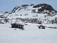 Parkerte ved Øvlandsstølen ettersom veien inn Valldalen ikke var brøytet ennå (hadde ikke forventet det heller). Valgte å ta turen over Tjørnastølskaret, da jeg ikke visste hvordan snøforholdene var langs veien på den bratte østsiden av Klentenuten. Sekken var (som vanlig når jeg skal være vekke i flere dager) tung, og det samme gjaldt skiføret. Men jeg kom meg fint over skaret og ned til Grytingstøl. Her var derimot våren absolutt kommet og de neste 6 kilometerne >>>