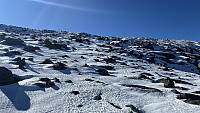 Dag 4 av min «høstjakt» på 2K-topper. Fikk bruk for både truger og isøks, mens stegjerna fikk ligge i sekken. Skal si isøksa var god å ha for klyvinga opp til Veslfjelltinden fra bandet mot Loftet. Med snø i steinura og på svaene var det stedvis veldig glatt. Glatt og bratt steinur opp til Loftet gjorde at jeg i alle fall ikke ville returnere den veien jeg kom opp, og klyving ned ura ved kanten av Brangsbrean ned fra Veslfjelltinden fristet heller ikke - så jeg valgte å ta den lange runden om Krossbu for å komme ned en mye sikrere rute. Og det må jeg si var en MYE enklere/tryggere rute med de gitte forhold.