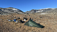 Dag 2 av «høstjakta» på 2K-topper fortsatte med strålende september-vær, men på toppene blåste det heftig med kuling i kastene. Gikk opp fra P-plassen ved bommen/nasjonalparkgrensa i Veodalen (1300 moh) og satte opp telt på en fin gressbakke på 1600 moh før terrenget gikk over i steinur.