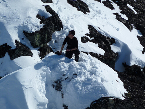 Høydepunktet ble da det kom "folk til unnsetning" ved Leirungskalven, og fikk meg med over. Det hadde jeg ikke gjort alene, og heller ikke hvis jeg hadde visst at det var nærmest bare løssnø som bar oss over de bratte dype kløftene mellom steinene på ryggen. Dette var ikke for "hvermannsen". Jeg satt og vurderte om jeg tore, da CPU og en kompis kom. De gikk uredde foran ned lia, og ut på eggen, Der låste det seg imidlertid for kompisen, og jeg og LCU kravlet oss helt ut på Kalven og tilbake. Da våknet kompisen og han gjentok bragden vår. Puuhh! Vel oppe tok vi farvel og jeg fikk tips om noen sekundærtopper jeg ellers ville ha glemt. Flott retur, men slitsomt over myrene vel nede, da solen hadde gjort alt vått og råttent. Topp dag i solstek!