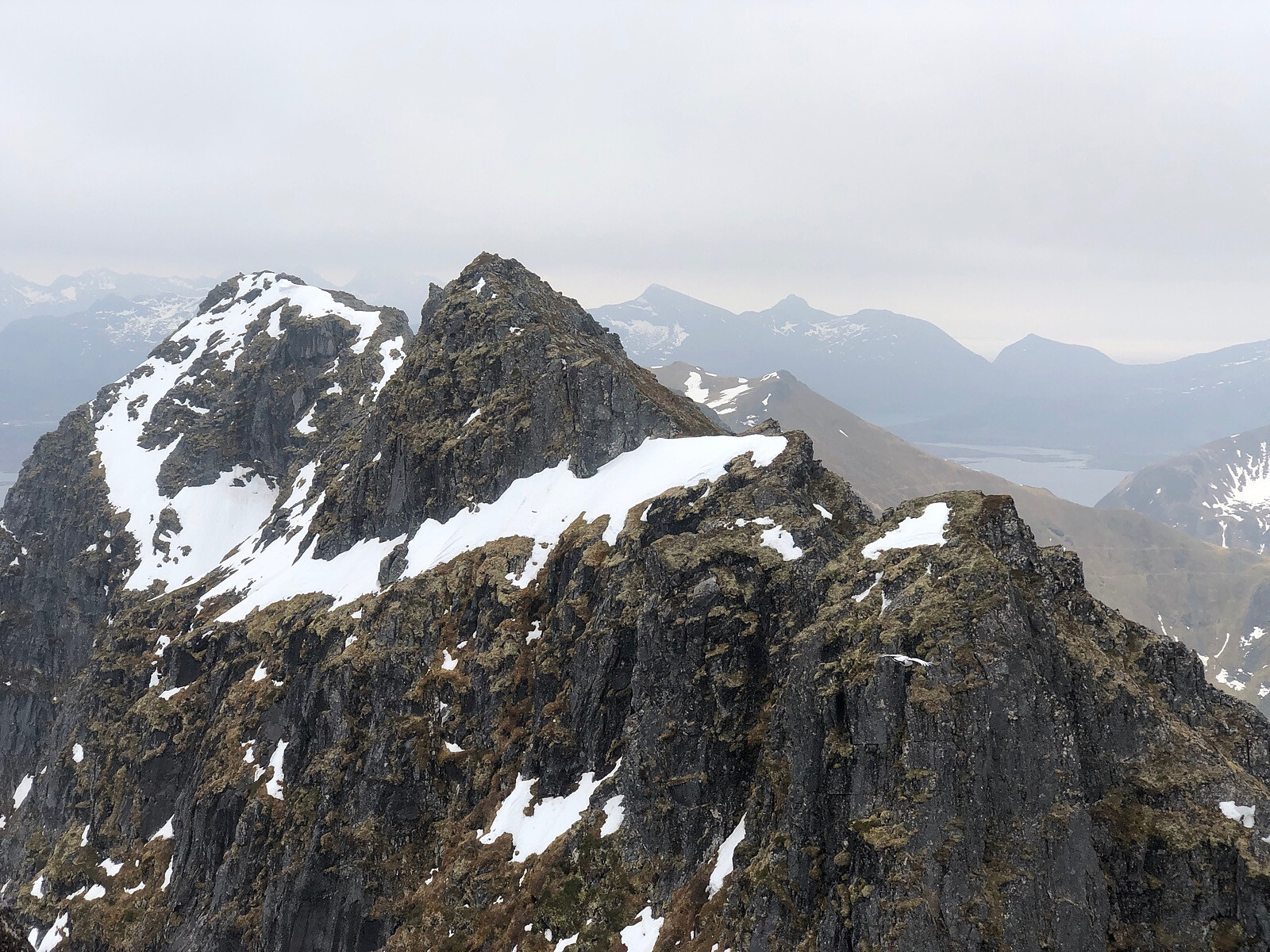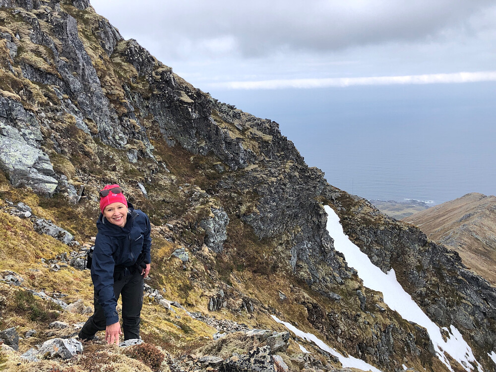 Svært bratt rygg, med snøbre i renne opp øst for toppen. Noe krevende rutevalg.Med Rusla.