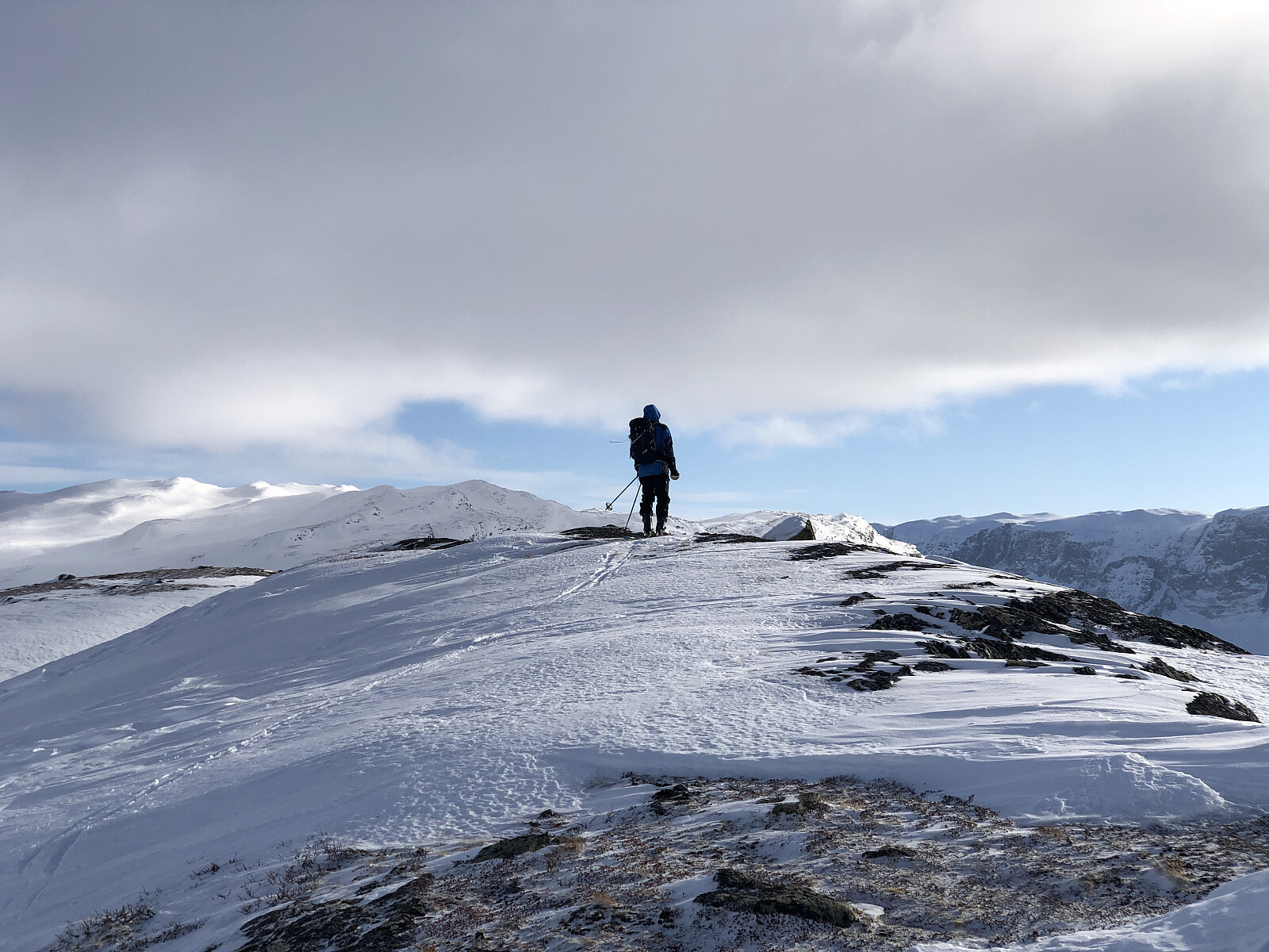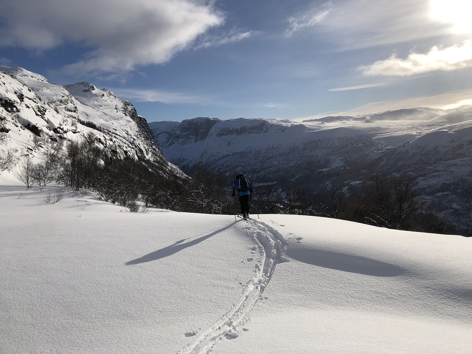 Og så kommer lyset, som gjør konturene skarpe. Vi sikter oss inn på et snøbasseng rett vest for Søre, sør for vann 1351 moh, for å få litt ekstra fin kjøring. Vi koser oss ned i Svindalen. På med feller og opp i høyden igjen, opp på ryggen av Ryggen, som vi så følger fremover, slik at vi slipper å labbe ut dalen, som er relativ flat.