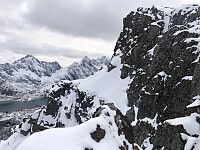 Vel oppe på ryggen er det luftig med fantastisk utsikt mange veier. Også mot Vestfjorden, Stamsund, Breitinden, som jeg nettopp hadde besøkt, og ut til Værøy.