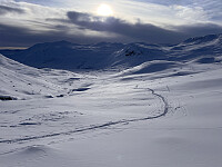 25 minus, fem timer alene i fjellet. Dyp pudder i oppstigningen vest for Bjørndalstjernet og magisk utsikt fra Slettningsegge. En perfekt dag.