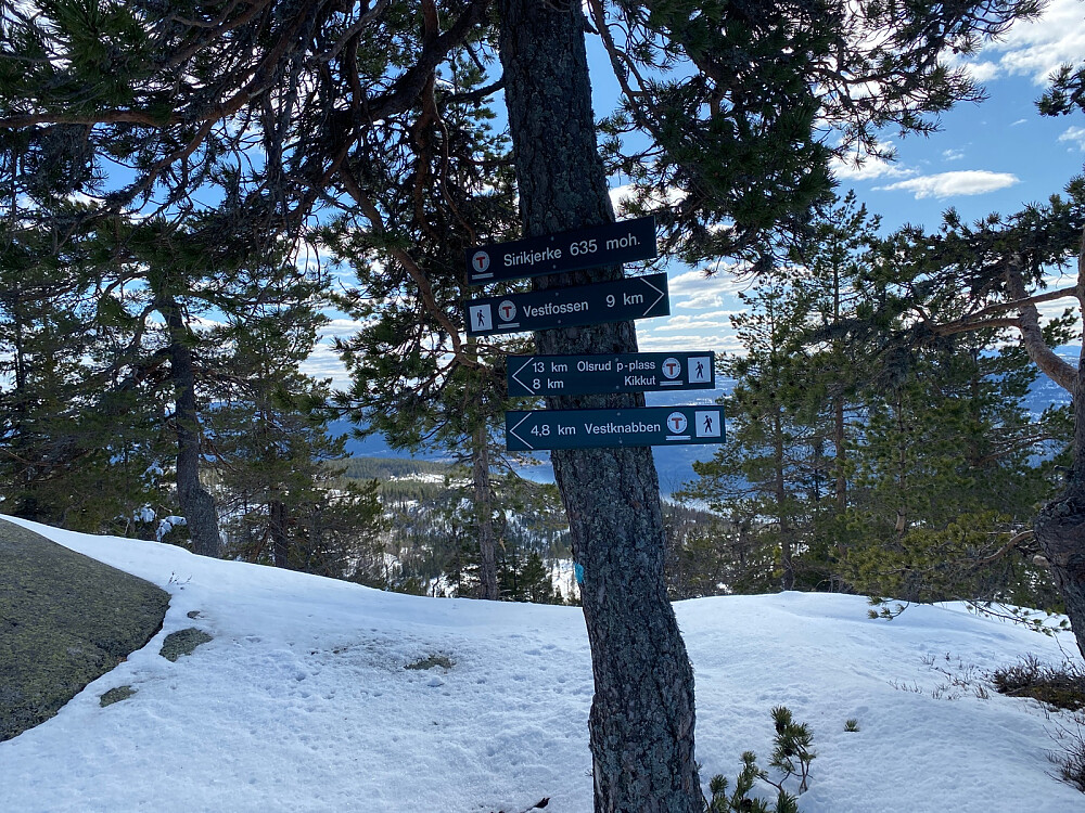 Litt forbi p-plass på 512 moh går stien opp til toppen og jeg var veldig spent snødybden og om det var noe bæring. Det skulle vise seg å bli en ganske strevsom tur oppover. Ikke bare vært til tider vrient følge merkingen på trærne, men innimellom sank jeg jeg fort 30-40 cm ned i snøen. Men en god del av turen, der jeg klarte å holde meg på stien, var det også et hardt lag under siste snøfall så det gikk da tålelig greit. Veldig fornøyd da jeg kom til topps og fikk strålende utsikt, en appelsin og en god pause. Nedover var det det atskillig lettere når jeg kunne følge mine egne spor, men tok et par andre rutevalg enkelte steder. Fra veien og ned til bilen ble det lufting, fortsatt i nydelig vær før det gjensto et par timers kjøring hjem.
