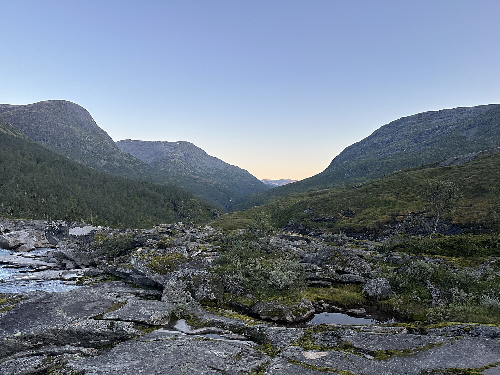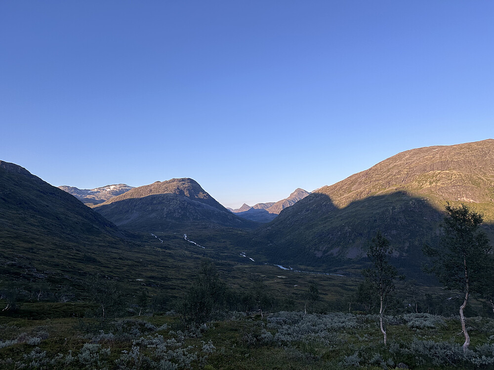 Jeg spiste litt før jeg lot meg sige nedover mot dalen. Svaberg og fuktige partier gjorde at å holde høyden var mindre gunstig. Bedre var det å gå langs med eleven på vide bredder dekket av mose og mykt steindekke. Foran meg sto Mannen og Gjertvasstinden. Tanken om at jeg skulle opp dit om noen timer var uforståelig.