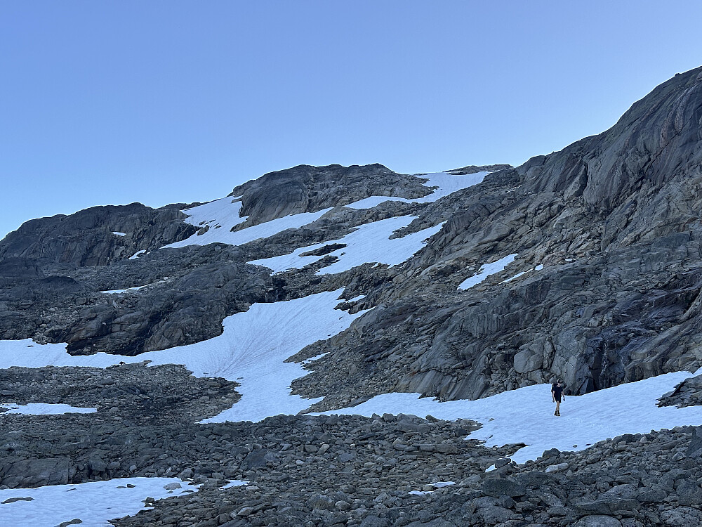 Snøbakken var relativt grei så vi gikk opp uten øks eller stegjern. Bløtt og fint i snøen. Breen på nordsida var helt isdekt - ikke et gram med snø igjen. Stor smelting her under sommeren.