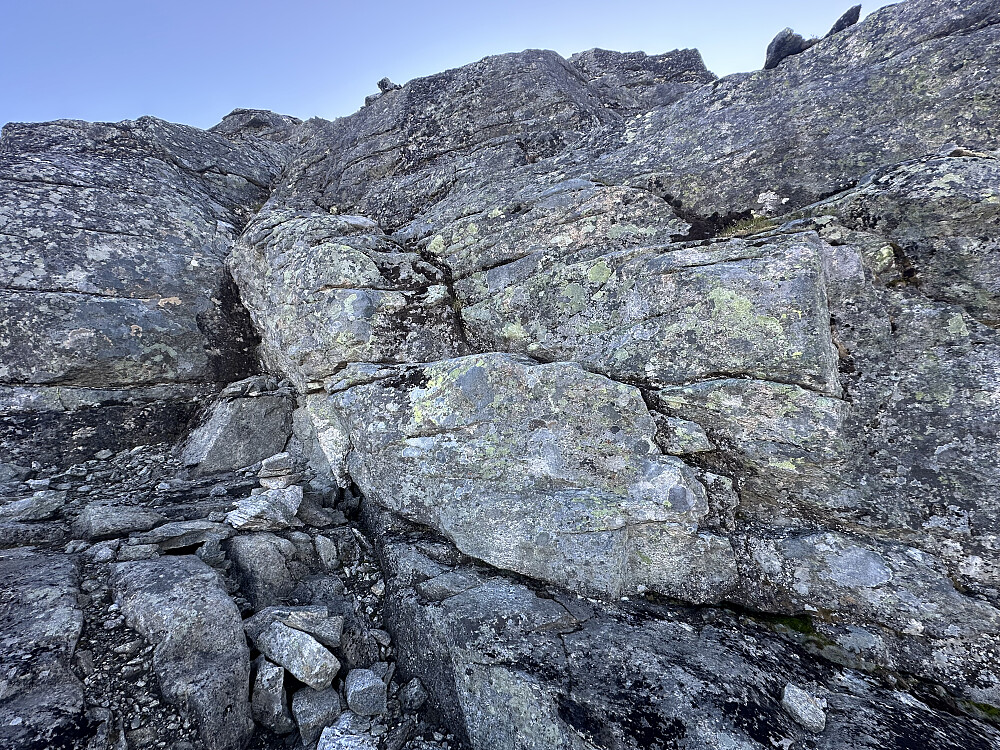 Nå reiste en berghammer seg foran oss. 3 meter høy uten de store svakhetene. Dette var nok cruxet og det punktet som Alex hadde lest om, og som gir hodebry om forholdene er slike som nå. ved normale snøforhold eller tidligere på sommeren er inntrykket at en kan omtrent spasere opp med ei isøks. Nå var det bratt med svaberg og ingen tilsynelatende svakheter.