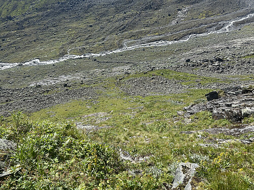 Renna besto stort sett av gress og var svært bratt i bunnen. Gress og lyng kom godt med for å holde fast i noe. Enkelte klyvepunker men ingenting å snakke om videre. Dette var stort sett greit. Mot toppen dro jeg mot venstre for å komme innpå litt slakere terreng. Veldig mye løst i dette området men helt kurrant. Merket også at det var veldig varmt her inne i sørsida. Det føltes til tider som en varmeovn. Godt å komme opp hvor en livlig bekk lyste i mot. Slokka tørsten og ringte Alex om at jeg var bokstavelig talt rett under beina på han, og at jeg fulgte renna i terrenget for å unngå høydemeterene opp til han.