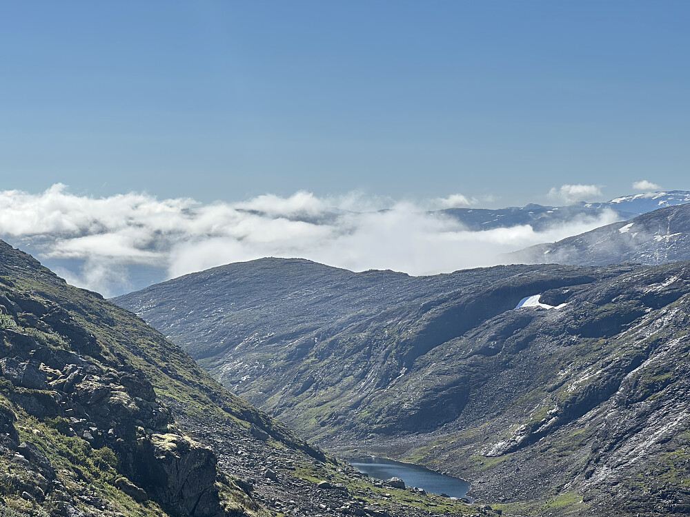 Skoddedalen gikk unna. Langs med det lilletjernet var det årsmøte for mygg i Jotunheimen. I alle skyggesidene på steinene var det helt tjukt med mygg. Virkelig spesielt fenomen. Litt brattere mot slutten men samtidig lettgått hele veien opp til neste dalsøkk. Her oppdaga jeg en varde som nesten var litt skuffende, men får da ikke bli for kresen heller.