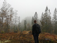 Våte på beina fra turen til Heståsfjellet bar det nå videre til Lauvkollen, høyeste punktet her omkring. Hadde et lite håp om noe utsikt fra denne, men hadde ikke høye forhåpninger.
