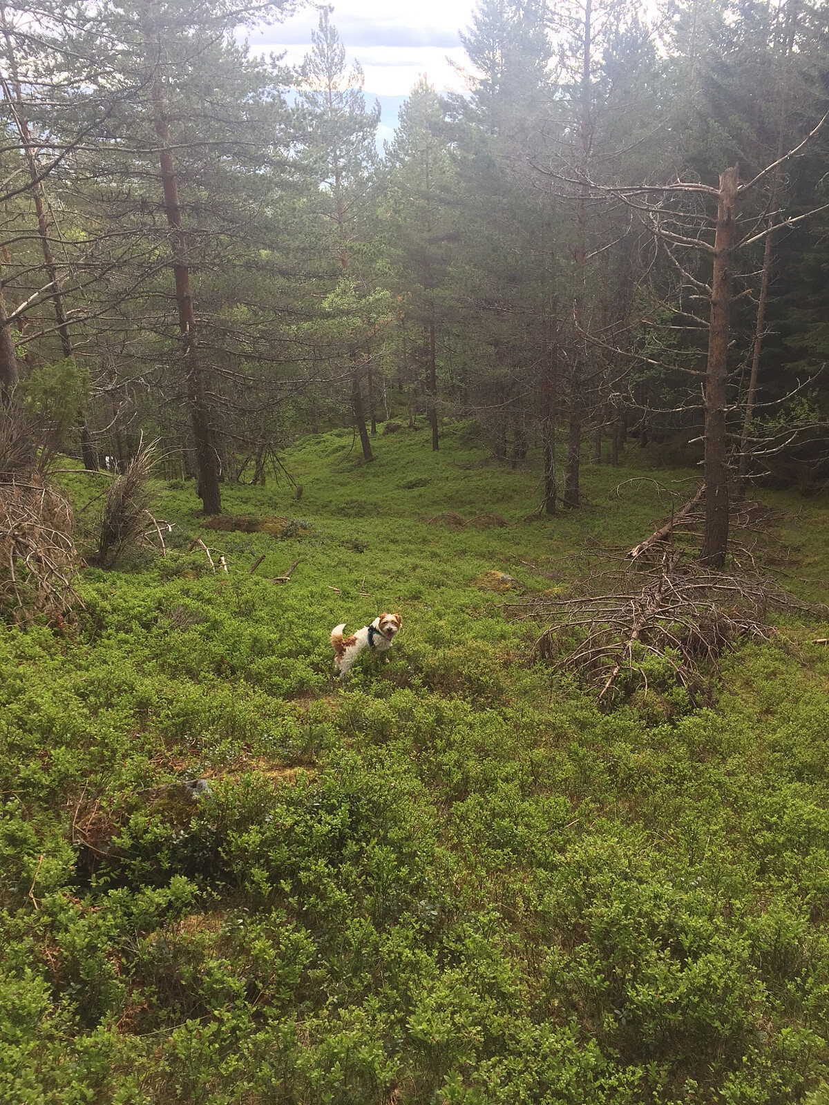 Lett vandring i lyng opp til stolpen på toppen. Noko utsikt. Nokre dyretråkk her og der som ikkje er verdt å følgje. Møtte på ei rype og ein hjort, elles var det lite å skrive heim om.
