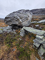 Etter en forsøk på å finne noen gamle tufter ved Store Sandgrovvatnet på morgenen, ble avgjørelsen tatt om å gå på Geitsida idag. Planen var Fossafjellet, men vinden var stri på morgenen gjennom Sandgrovbotn. Begynte turen med å sjekke ut et fangstanlegg ved vann 1085 på nordsiden av Sandgrovsnyta, fant mange bågåstø fra den gangen man jaktet rein med pil og bue. Videre mot Litlehaugen var fin rusletur, sjekket ut en hytte som fjellstyret bruker til tider nå. Ved tjønna før Geitsida lå det også en hytte som hører til en nede i Eikesdalen. Fra toppen av Geitsida er det fin utsikt nordover Eikesdalsvatnet, og til lenger ned mot kanten man går jo råere blir det. Gikk så rett vest og ned til utløpet av Mardalsfossen, litt bratt nedover men fant beste veien ned. Så lite >>>