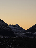 Første tur for helgen ble Sandgroveggen etter å ha sett litt på snøforholdene i fjella her oppe idet vi kjørte innover langs anleggsveien. Vi parkerte der stien går ned mot Eikesdal, og da var det bare å ta fatt på bakken opp til toppen etter ca 5 min flatt. Greit i starten, snøen ingen hindring. Men i siste bratta gikk det akkurat fint å komme seg opp, holdt man litt mot vest så hadde solen tinet det meste av snøen. Oppe på toppen så er det bare å rusle 1,5 km sørover i stein og grus til man er på høyeste punktet. Vi valgte å legge turen videre sørover en stund, så bøye av rett vest og gå ned ca der hytta på Mjølrakkhaugen ligger. Gikk greit å komme seg ned, men bratt nok noen steder og noen sva. Så var det bare å rusle inn i solnedgangen tilbake til bilen. og kjøre >>>