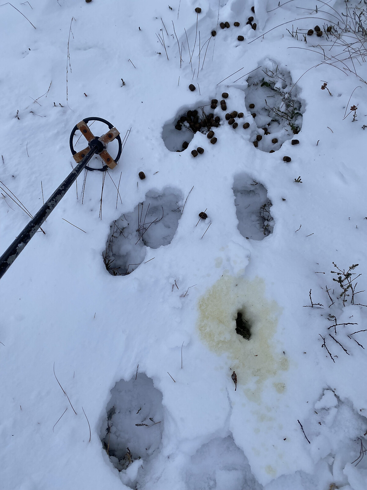 Me fekk ein flott tur på isen langs vasskanten og vidare oppover Tysdalsheia. Her var det ganske bra skiføre – sjølvsagt på dei frosne myrene – men óg over lyngtuer og einerkratt var det godt med skia til hjelp. Det var ein god del dyrespor, i alle fall av hjort og truleg rådyr, og både urin og skit av ein retteleg sværing som må ha vore ein elgokse.