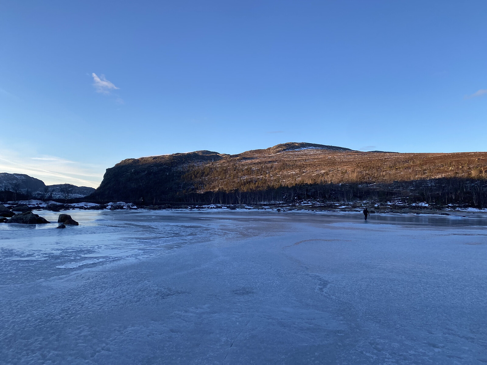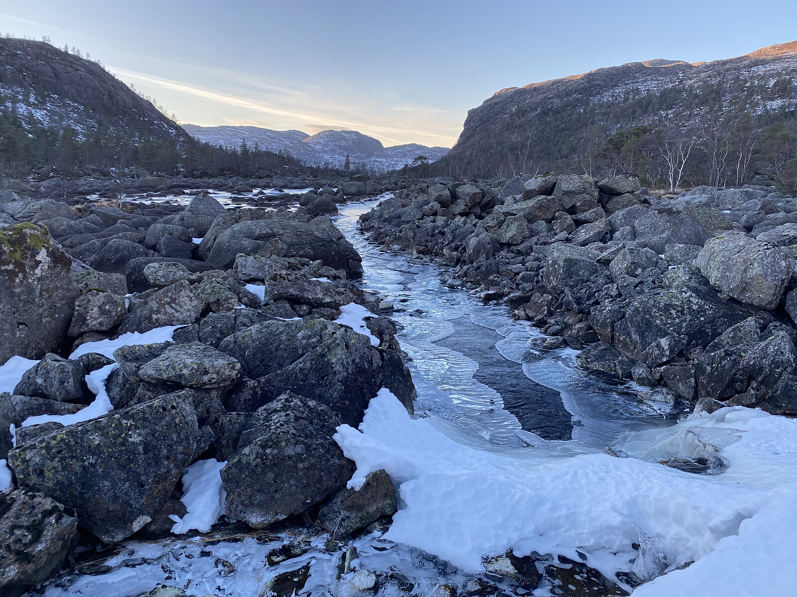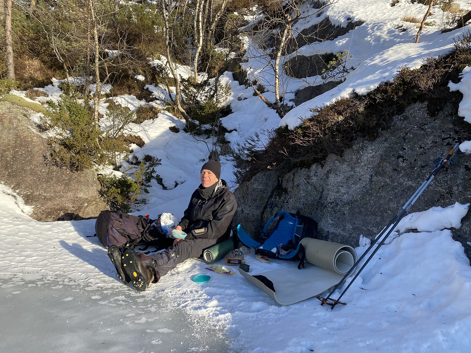 Turen opp til Svartavatnet kunne me for ein stor del ta i sjølve bekkefaret, som helst var attfrose. Oppe ved vatnet tok me oss opp på høgdedraget aust for utløpsosen og fekk dagens finaste utsikt, endåtil med solgløtt beint imot. Etter å gått ned på vatnet, rusla me litt forbi holmane, fann oss ei fin livdakrå og retteleg kosa oss på tur.