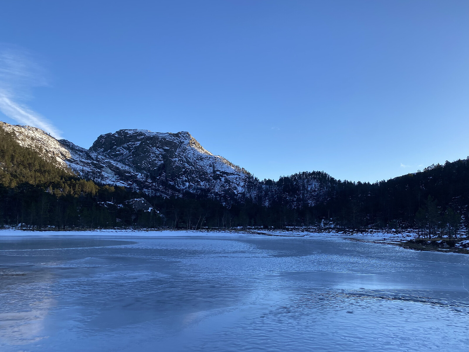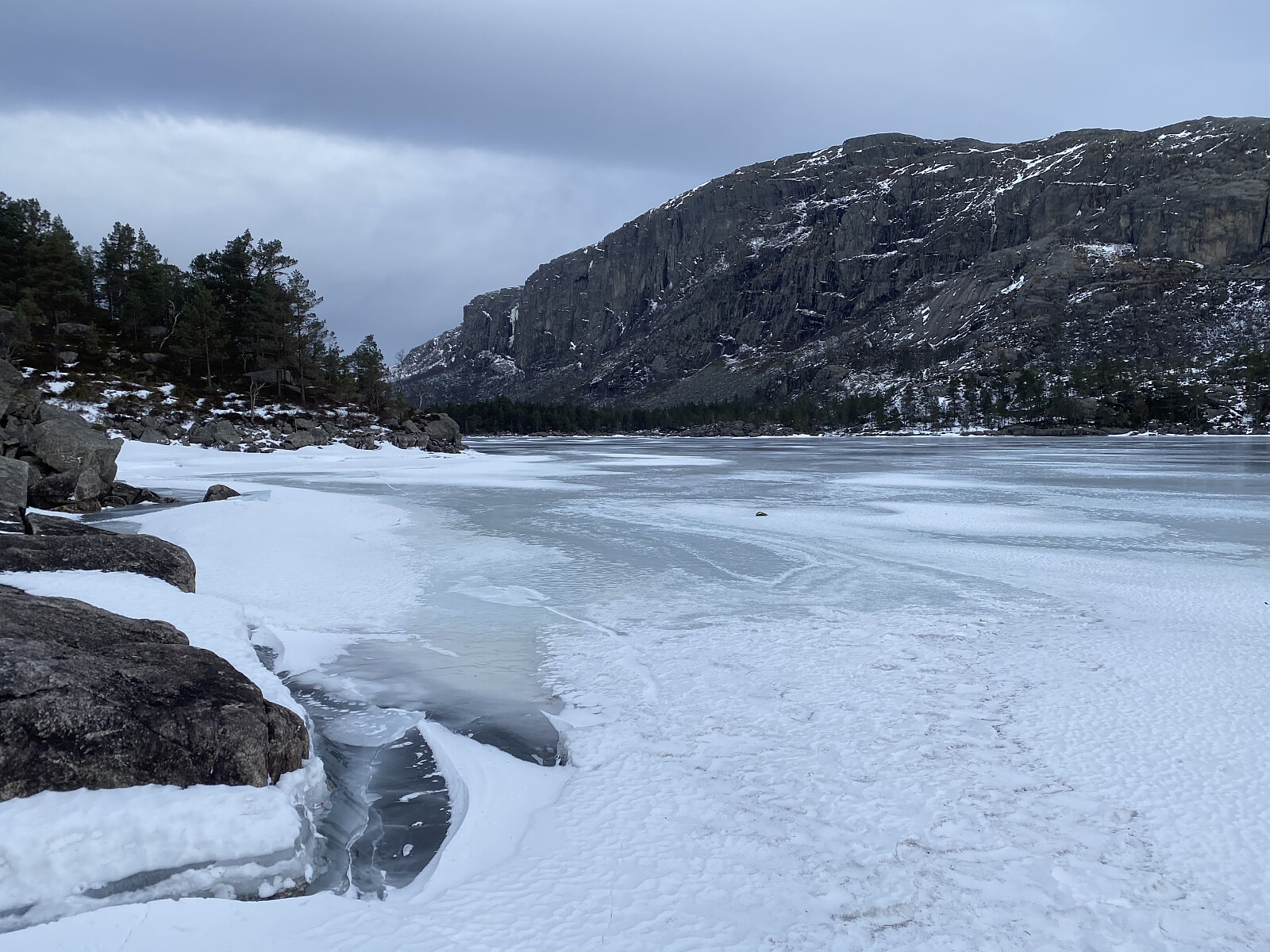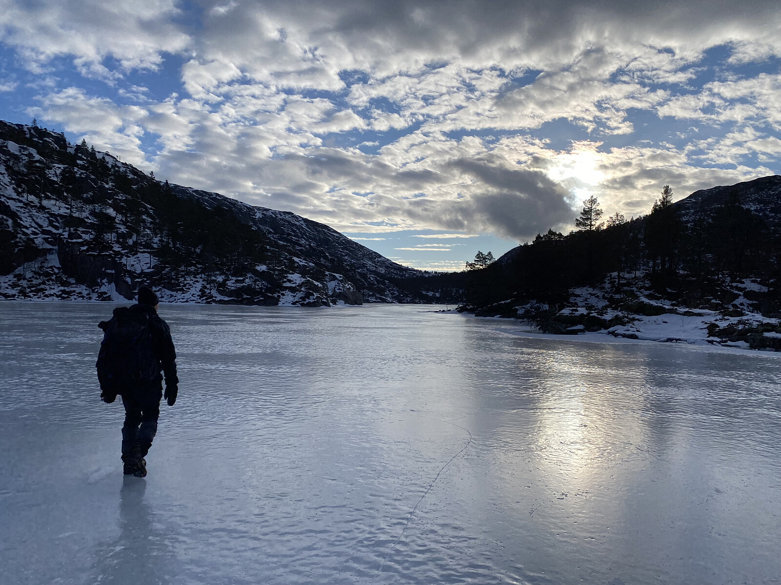 Endeleg – etter meir enn ein månad med mange minusgrader – var det trygt å gå på isen på Liarvatnet. Og med Jarle si hytte ved Forenesvatnet booka for helga, var det bare å legga ut på tur. Lørdagen sette me ein bil i Målandsdalen med plan om å avslutta der neste dag, og kjørte så rundt til Dalen. Det var meldt kaldt og fint vêr for helga, men kraftig austavind med både storm- og orkankast i høgda, så me var helst "rundkledde" ved turstart kl. 1020. Ein av oss nytta skeiser og to av oss broddar over vatnet, og det var ikkje fritt for at motvinden baud oss motstand. Det var óg tydeleg at isen innanfor Tunglandsneset var av det nye slaget – det er her inne vatnet er mest seinfrose.