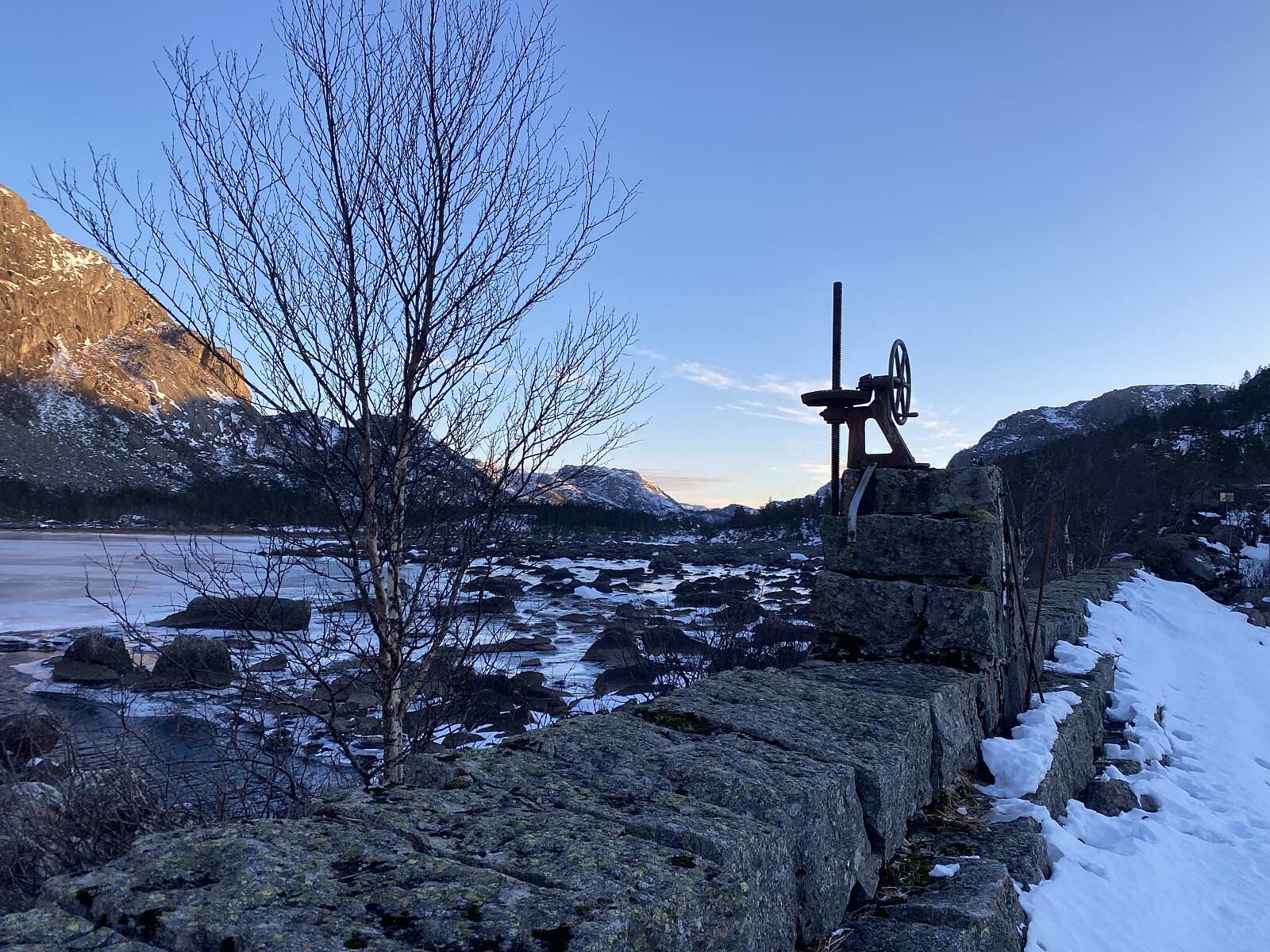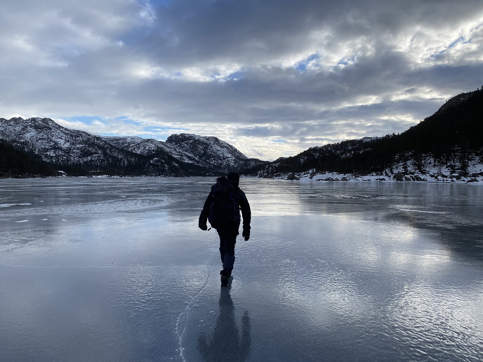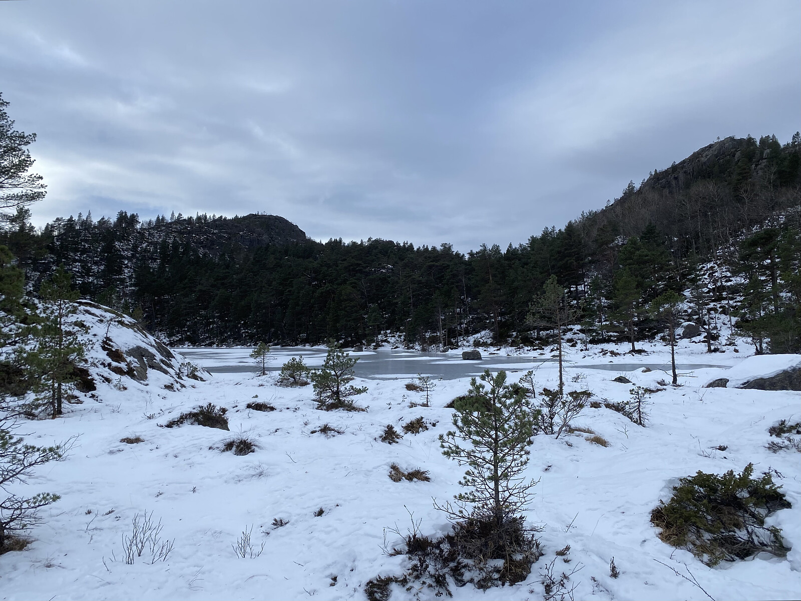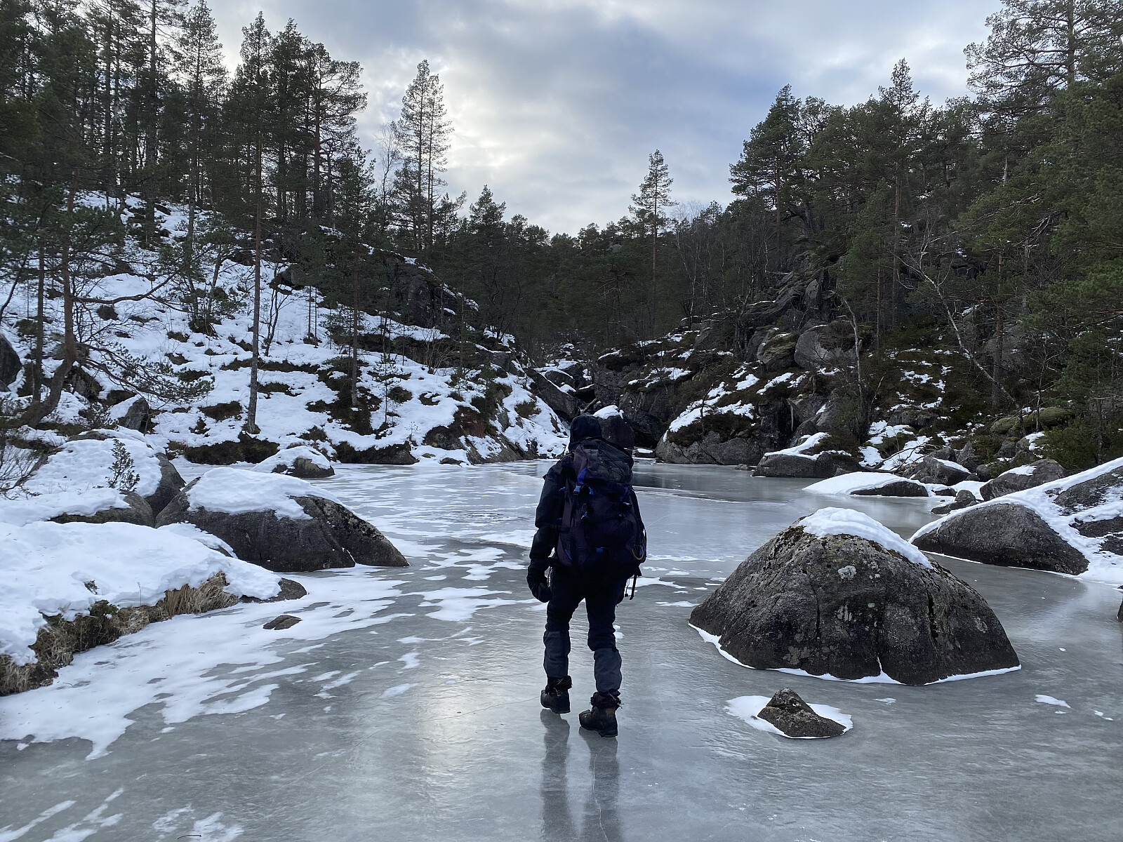 Endeleg – etter meir enn ein månad med mange minusgrader – var det trygt å gå på isen på Liarvatnet. Og med Jarle si hytte ved Forenesvatnet booka for helga, var det bare å legga ut på tur. Lørdagen sette me ein bil i Målandsdalen med plan om å avslutta der neste dag, og kjørte så rundt til Dalen. Det var meldt kaldt og fint vêr for helga, men kraftig austavind med både storm- og orkankast i høgda, så me var helst "rundkledde" ved turstart kl. 1020. Ein av oss nytta skeiser og to av oss broddar over vatnet, og det var ikkje fritt for at motvinden baud oss motstand. Det var óg tydeleg at isen innanfor Tunglandsneset var av det nye slaget – det er her inne vatnet er mest seinfrose.