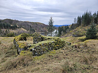 Videre på sti forbi en liten våg med bygning til nedfalls og gamle grunnmurer og videre på sti opp gjennom granskog til Tveitaneset.