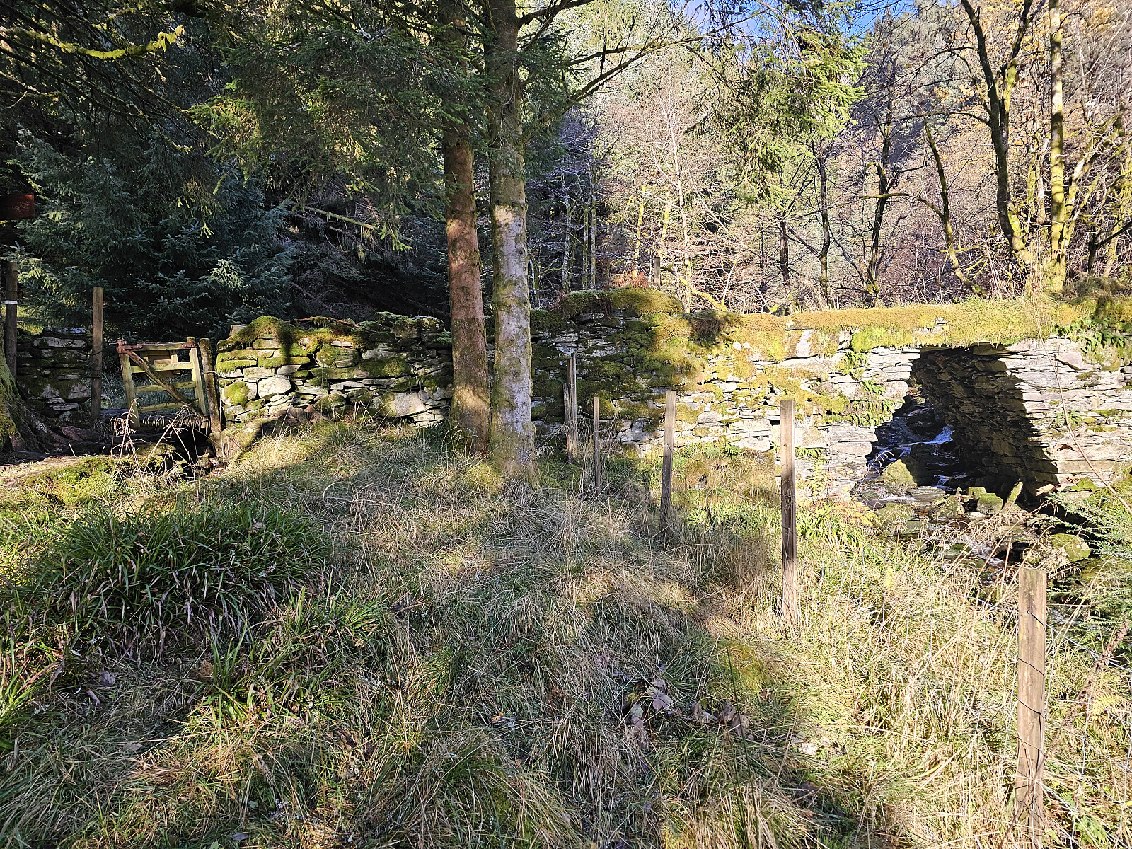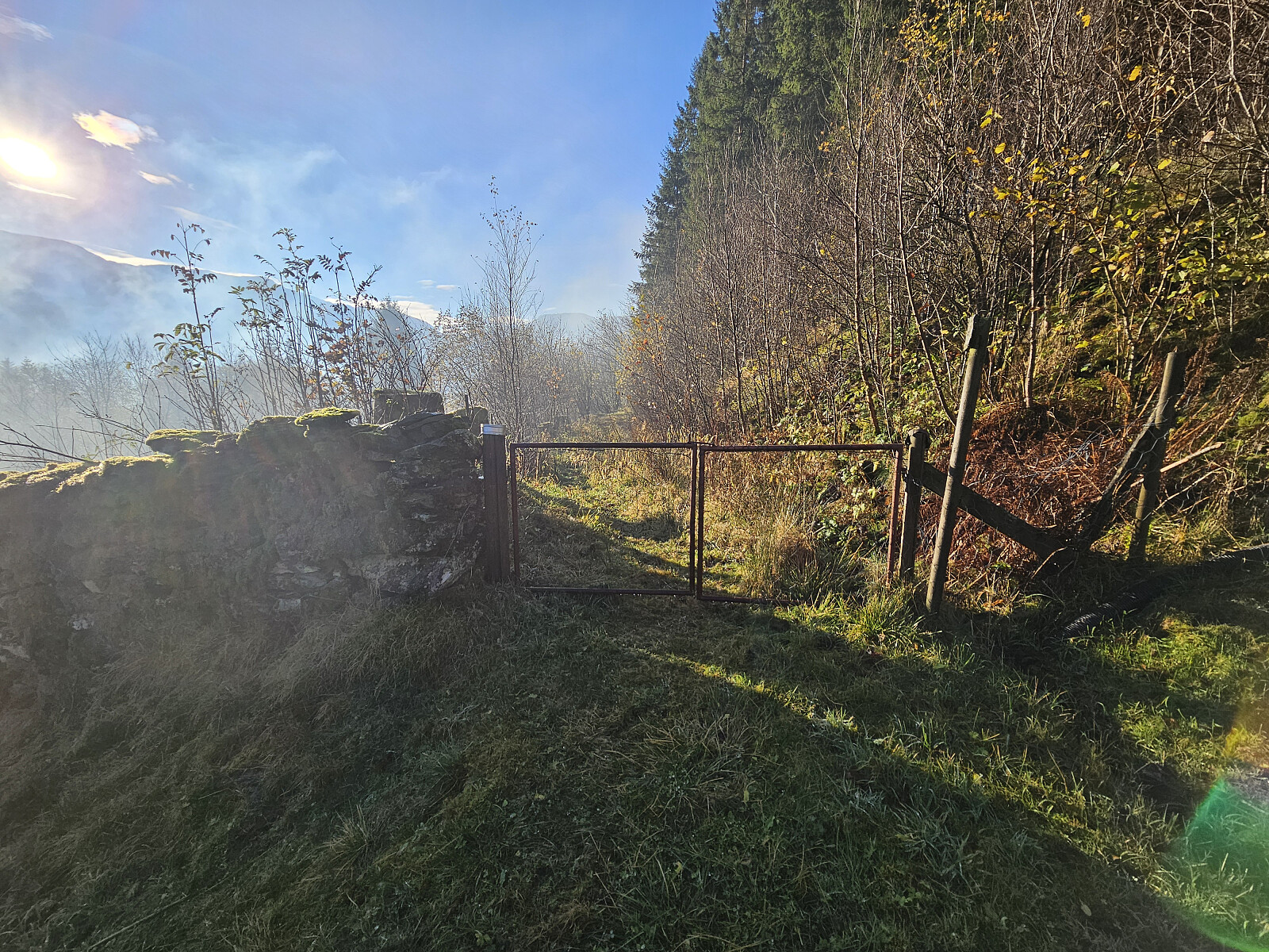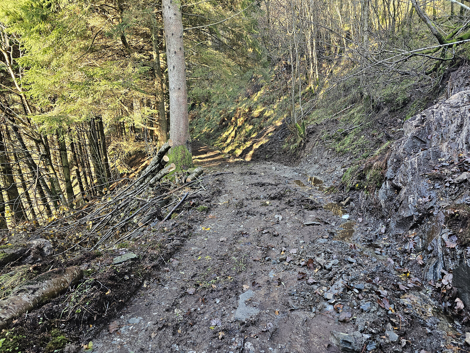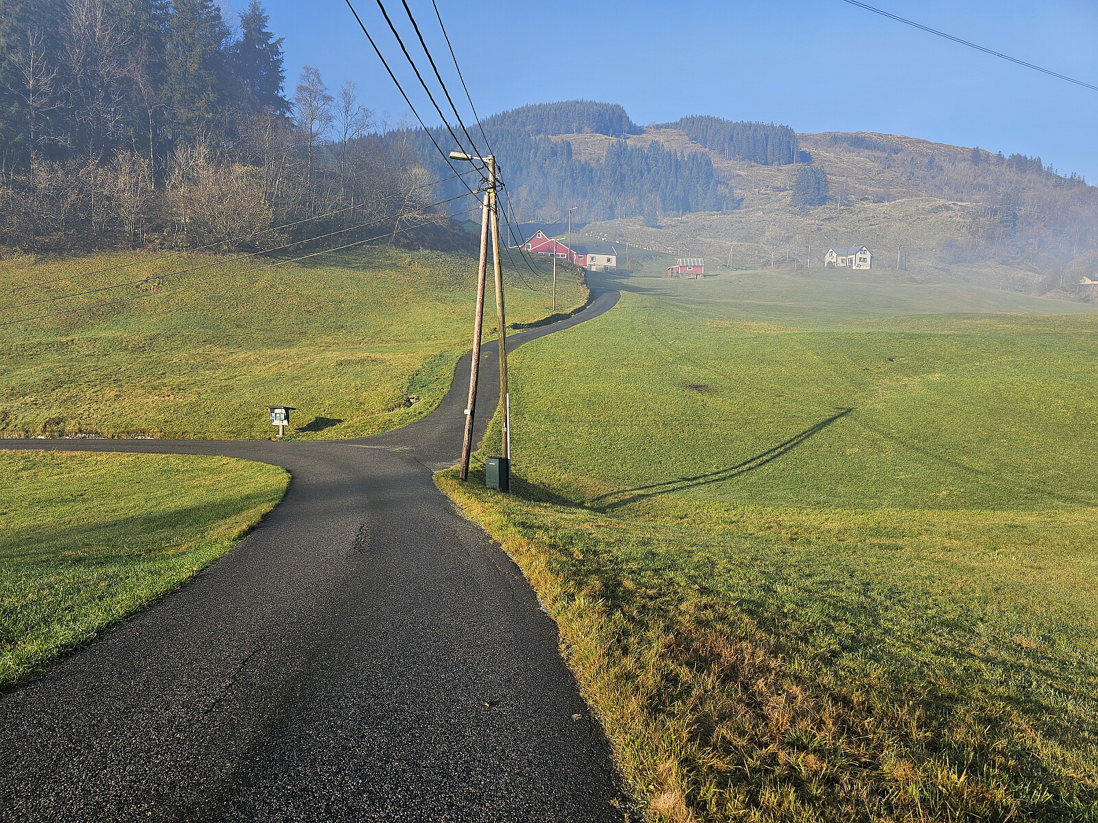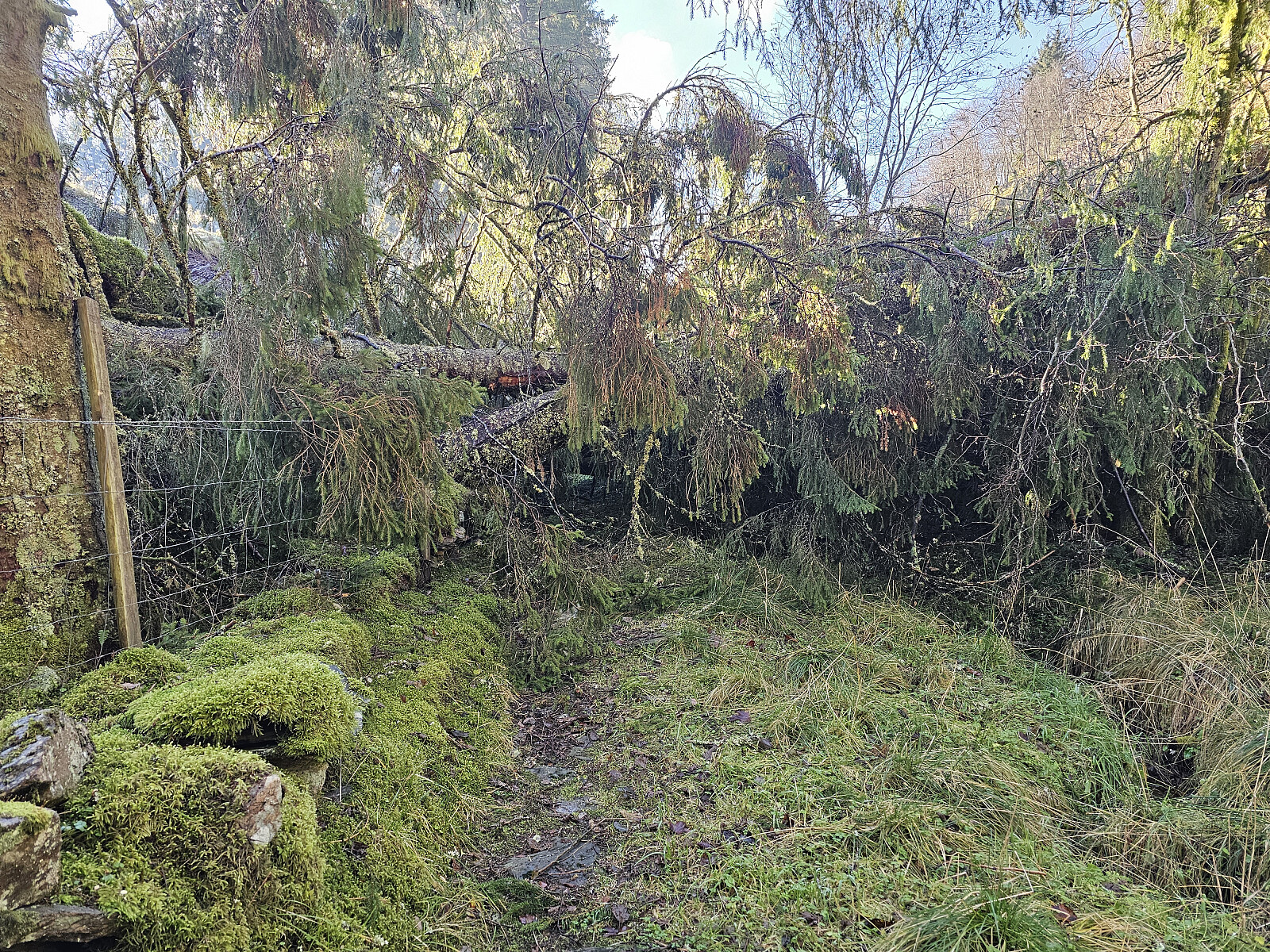 Tur fra Haukeland i Arnadalen til Erdalsvarden. Parkerte i en større møte lomme nedenfor Brattland gård. Gikk opp i tunet til gården der jeg tok inn postvei traseen Oslo - Bergen. Veien er bevart mellom Erdal og Haugo. Jeg fulgte postveien til Grytebakkbrua. Passerte flere rotvelt som var ryddet, men rett etter Grytebakkbrua var veien helt blokkert av store graner etter stormen Amy.
