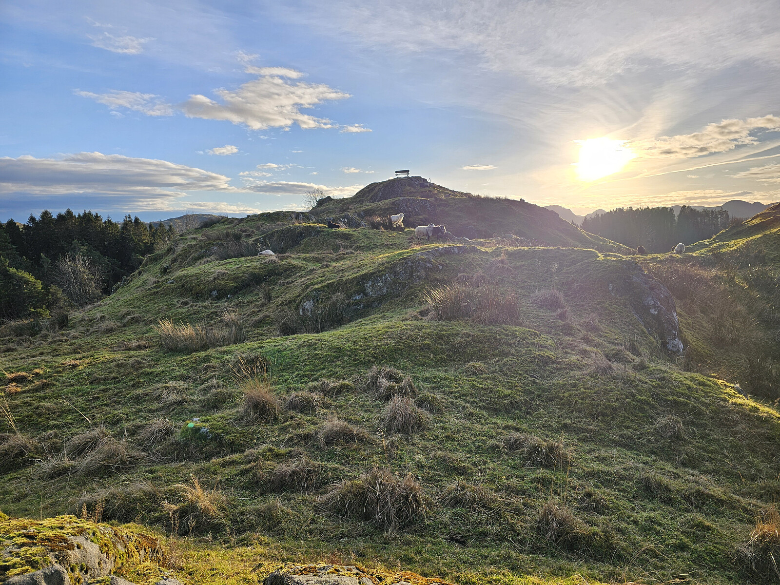 Etter Solendturen kjørte jeg litt sydover og parkerte litt vest for Lunde. Her er det god parkering med turtavle og skilting til Sæbøvågen. Kort tur opp til toppen på Klubben der det i dag var en stor flokk med sauer. Det ble mye bræking da jeg rotet meg inn i flokken. PÅ toppen er det skogfritt, fin utsikt og her kan man slå seg ned da det er benk og bord. Jeg fortsatte ganske raskt sydvestover ned i en dal der det er sti som jeg fulgte tilbake til turstart. En mindre brukt sti her som følger myrkanten tilbake.