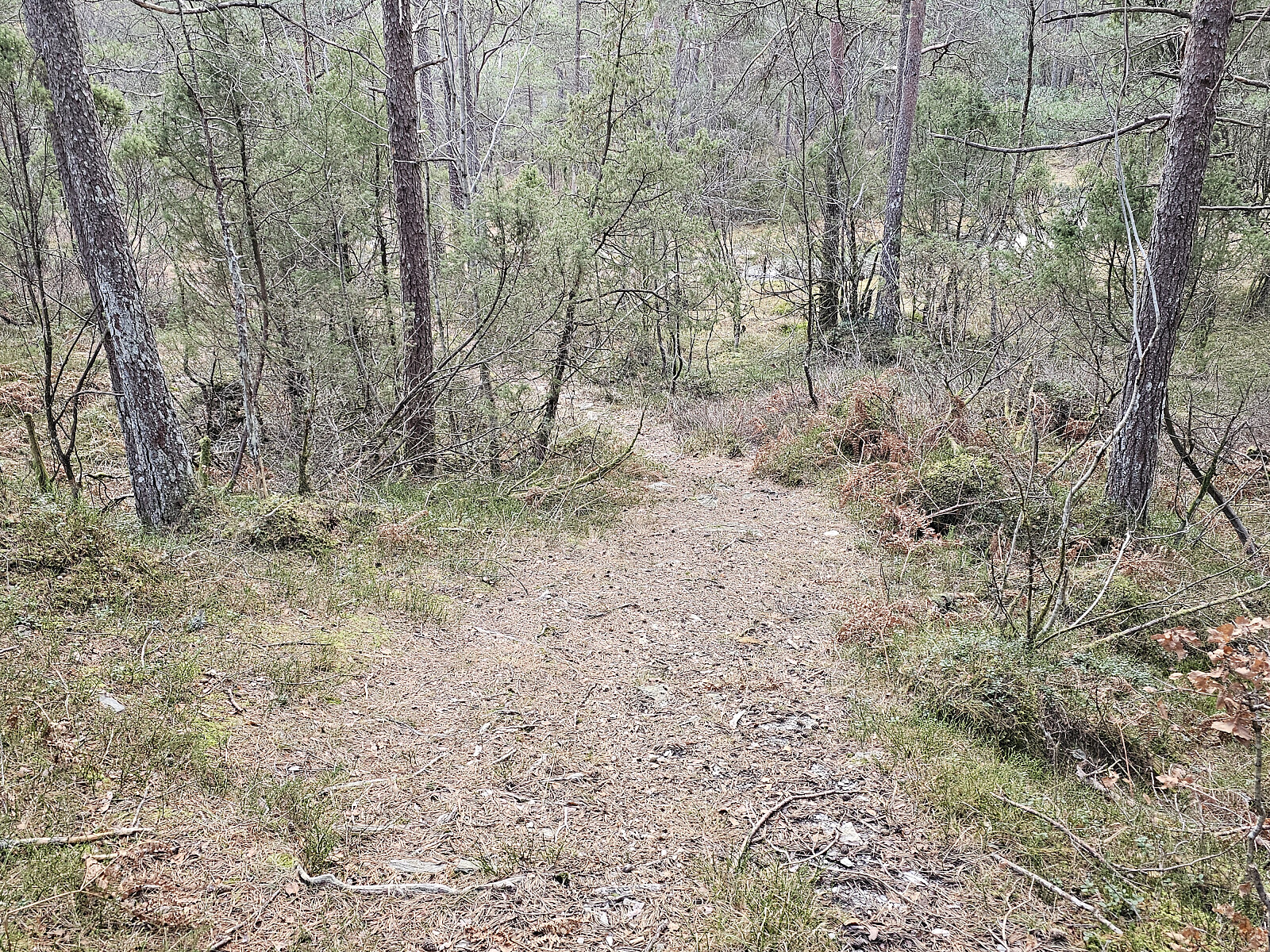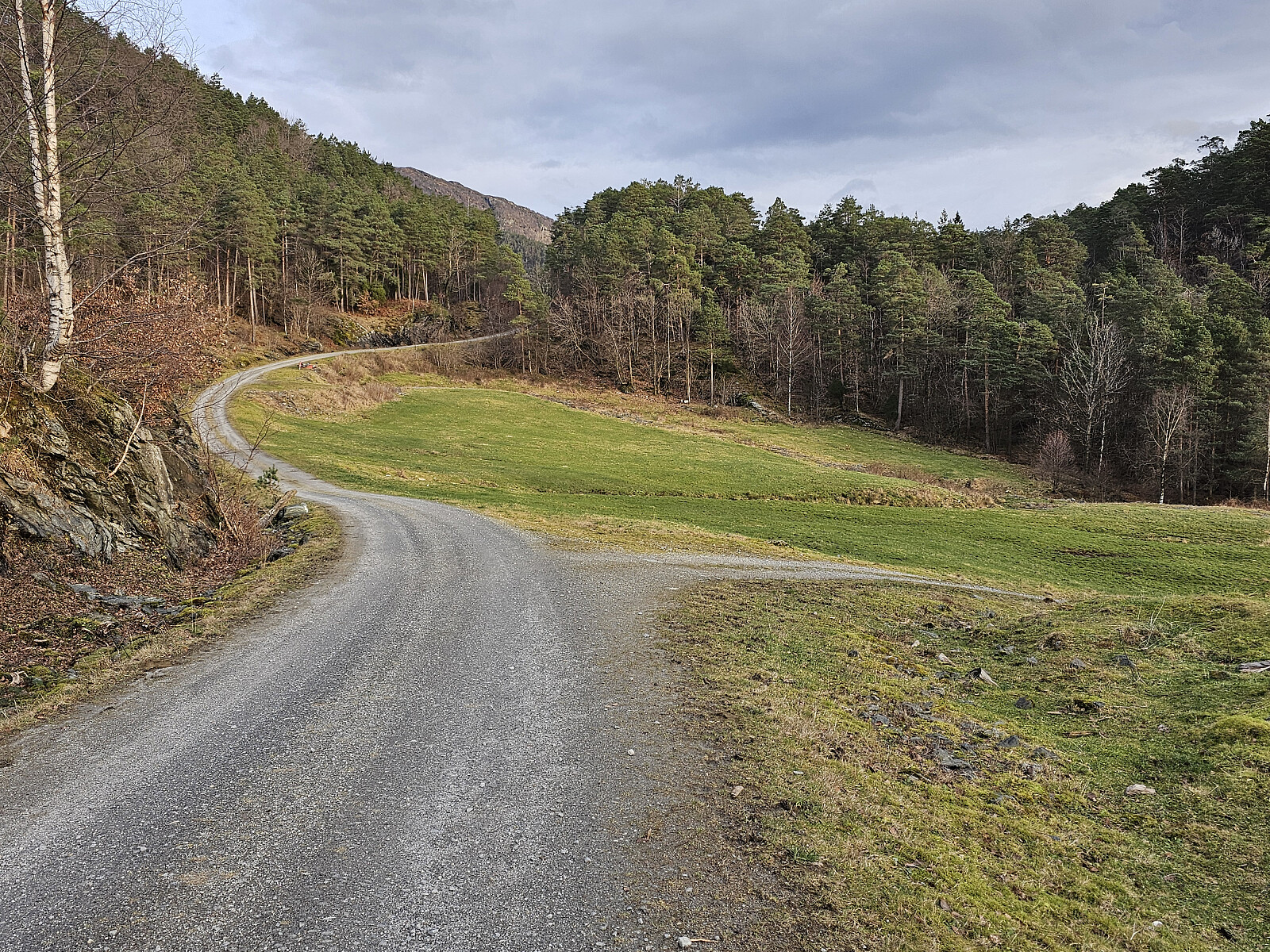 Startet fra Lingavegen rett nord for Campingvognplassen og fulgte skogsveien nordover. Tok av og gikk ned til Storavatnet på dårlig traktorvei. Nede ved Ystavassvika var det bløtt og her stoppet traktorsporet.