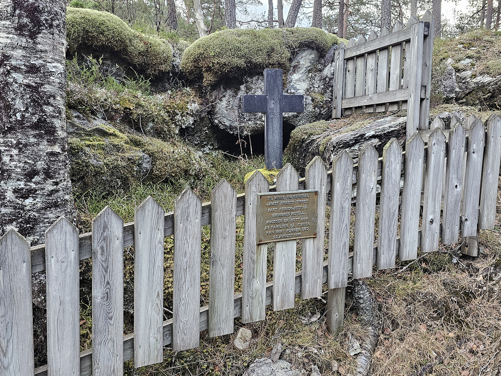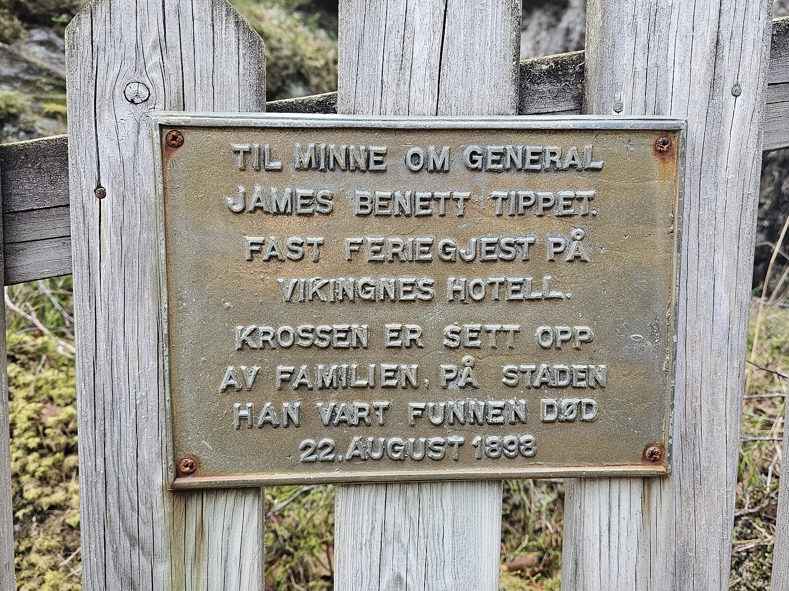 Fant sti på andre siden av myrpartiet som jeg fulgte videre. Kom straks til et kors som var inngjerdet med en minneplate som forteller at her ble General James Benett Tippet funnet død i 1889. Han var fast gjest med sin familie på Vikingnes Hotell om somrene. Familien har sener montert et kors på plassen.