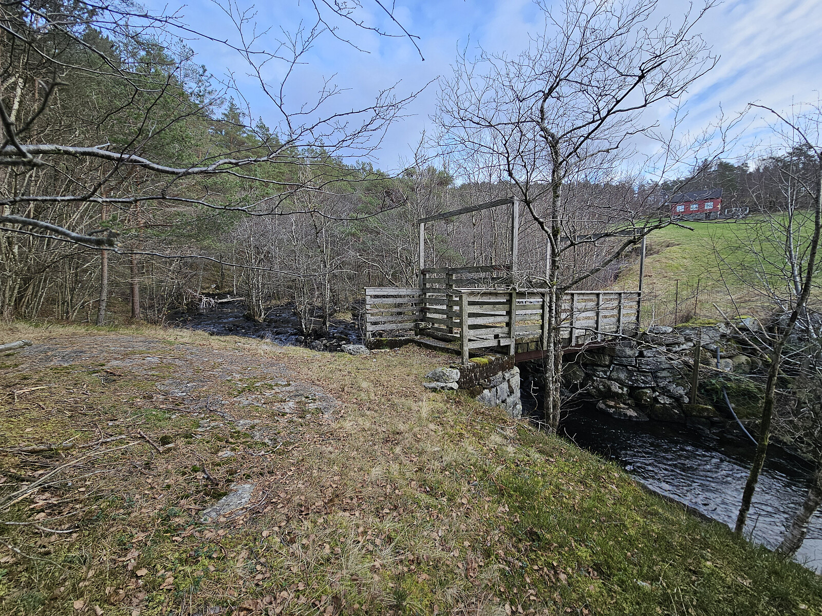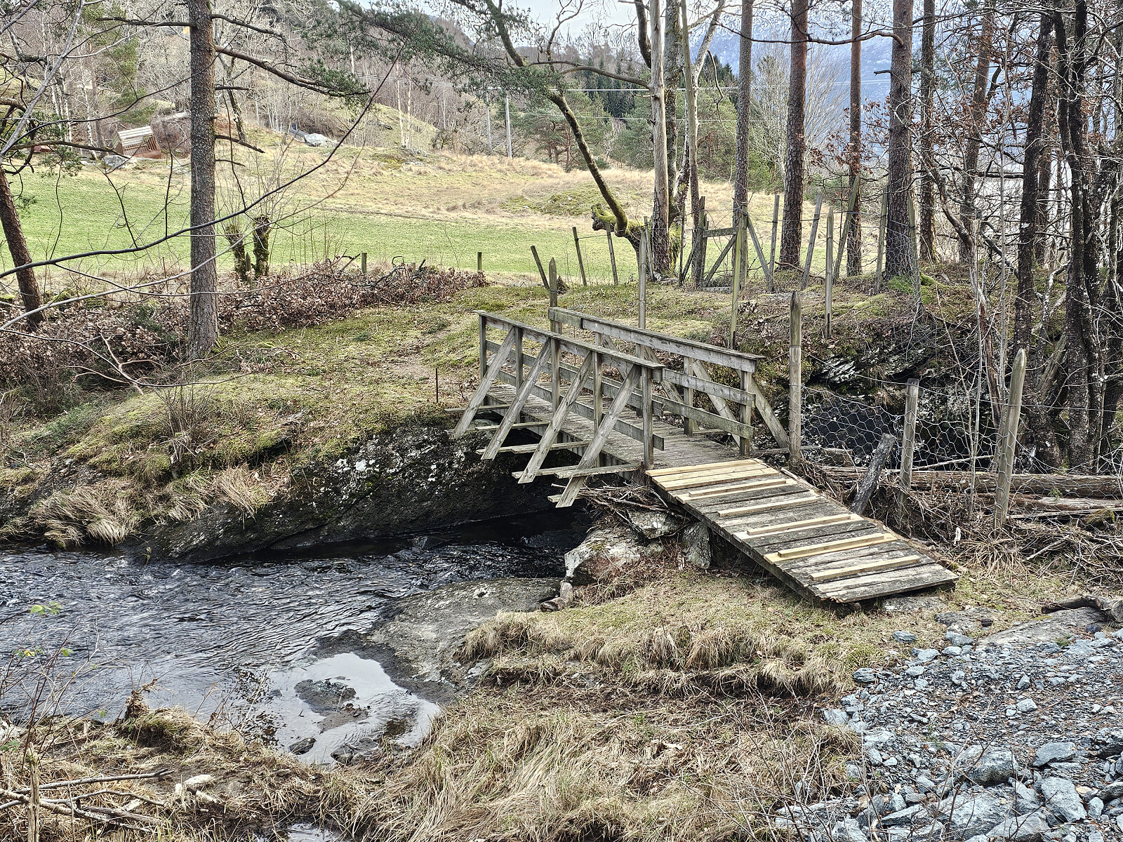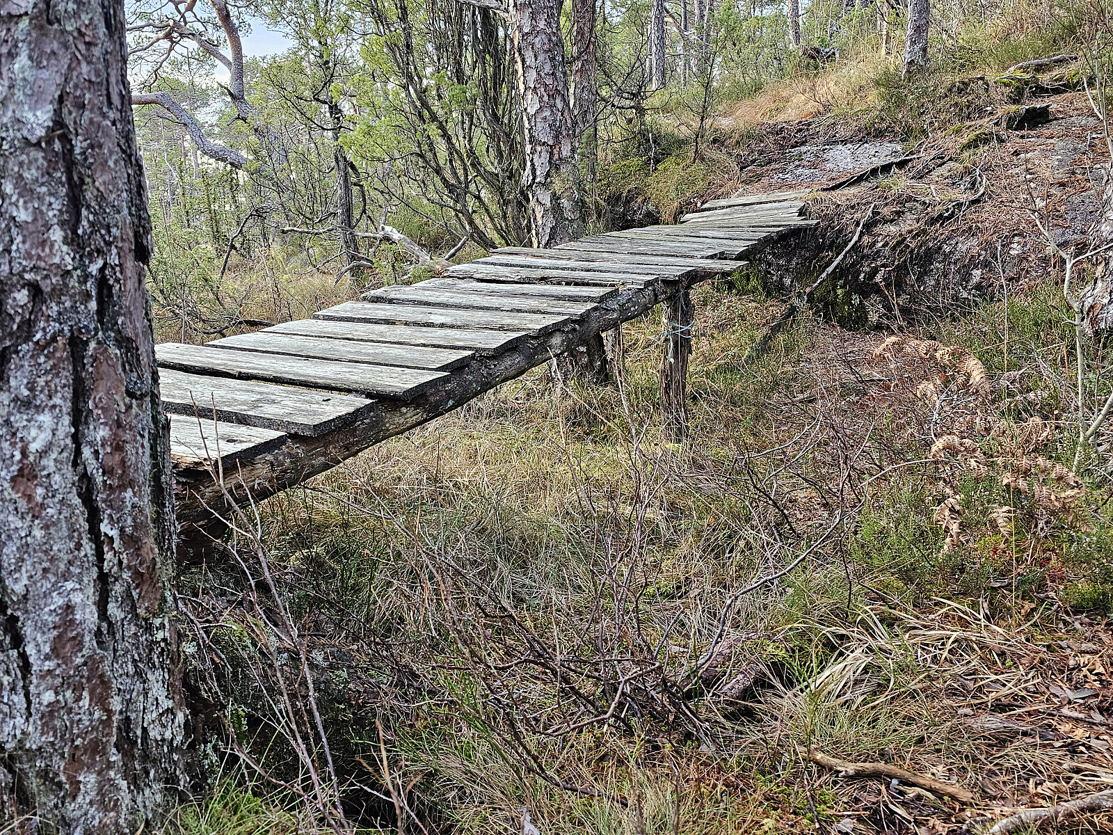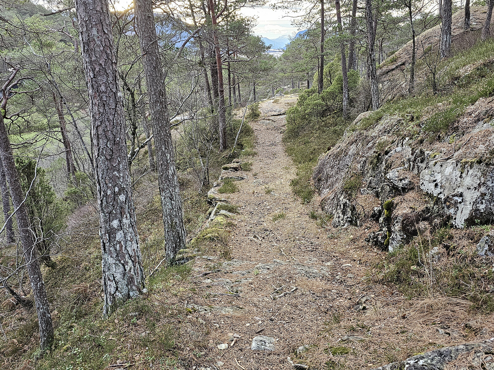 Bestemte meg for å følge hovedstien tilbake ned ryggen mot nord og følge den videre mot syd på østsiden av Øykhageskolten. Nedover her var stien flere steder opparbeidet som en smal gammel ferdselsvei. Jeg så 2 broer som gikk over Røyrvikelva, jeg valgte og gå over den nederste og kom da ned til gårdene på Røyrvik. Derfra på hovedveien tilbake til turstart.