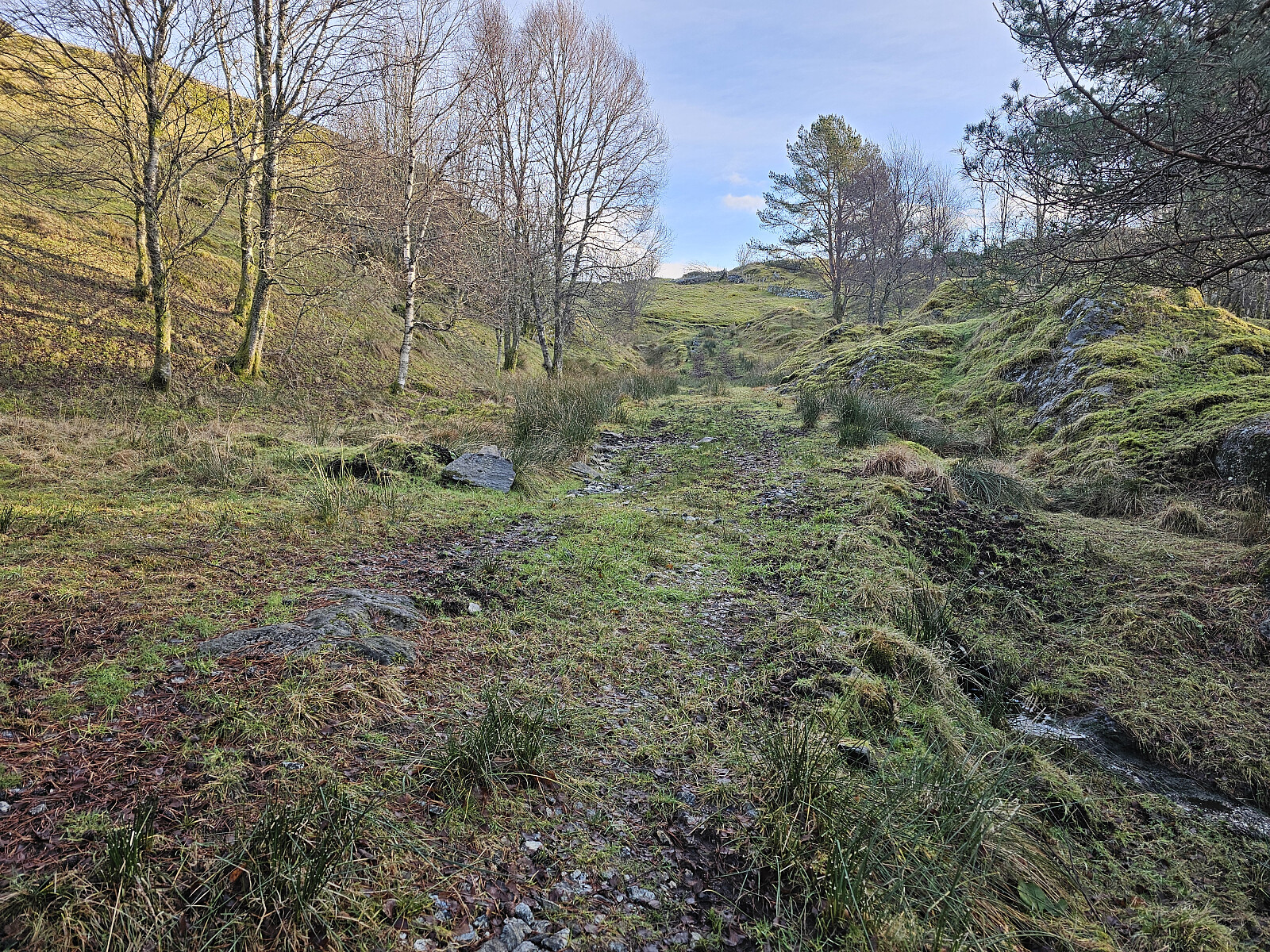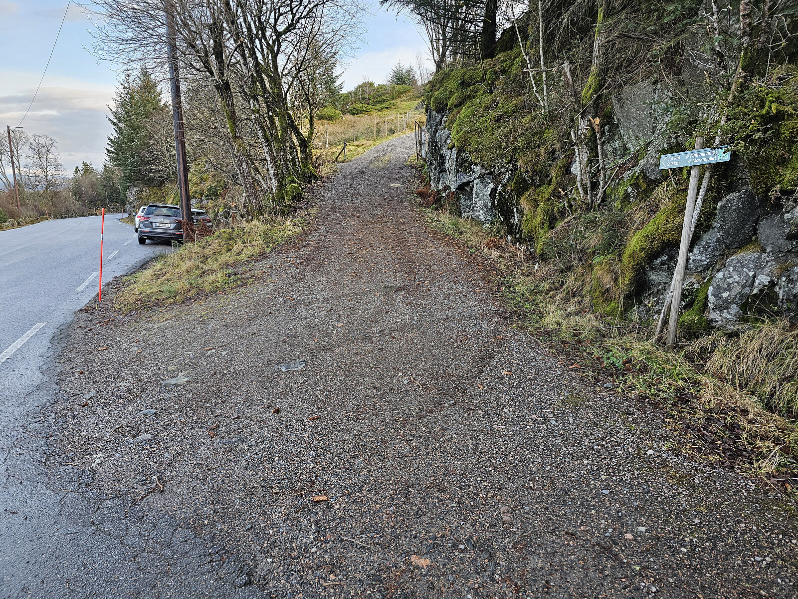 Etter turen til Orrtua kjørte jeg et lite stykke nedover fra Bontveit og parkerte ved en skogsvei. Hadde planlagt en rundtur på skogsvei på østsiden av Ulvsfjellet samt å besøke hytten Fjellro som tidligere var bedriftshytten til trelastfirmaet Namtvedt, nå privat. Oppe ved hytten var skogsveien blokkert av store graner som var rotvelt etter stormen. Jeg valgte da å gå forbi hytten og ned en gjengrodd vei på østsiden. Derfra tilbake på skogsveien jeg gikk opp. Videre til neste turmål Neset ved Frotveitvatnet.