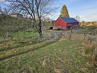 Kjørte litt videre sydover til Olsvold der jeg parkerte. Dårlig med parkering her så det ble litt på kanten parkering ved innkjøring til bolighusene. Gikk opp og gjennom tunet til et gårdsbruk og fulgte traktorvei oppover beiteland fra nordvest. Der gjorde jeg en tabbe. Her er det avstengt med høyt gjerde med piggtråd. Etter litt søking fant jeg et sted der jeg kunne trå over. Gå opp fra sydvest gjennom en port så er det sti og fritt frem uten stengsel til toppen. Videre til siste tur for i dag, Alver: Peparen nord på Radøy