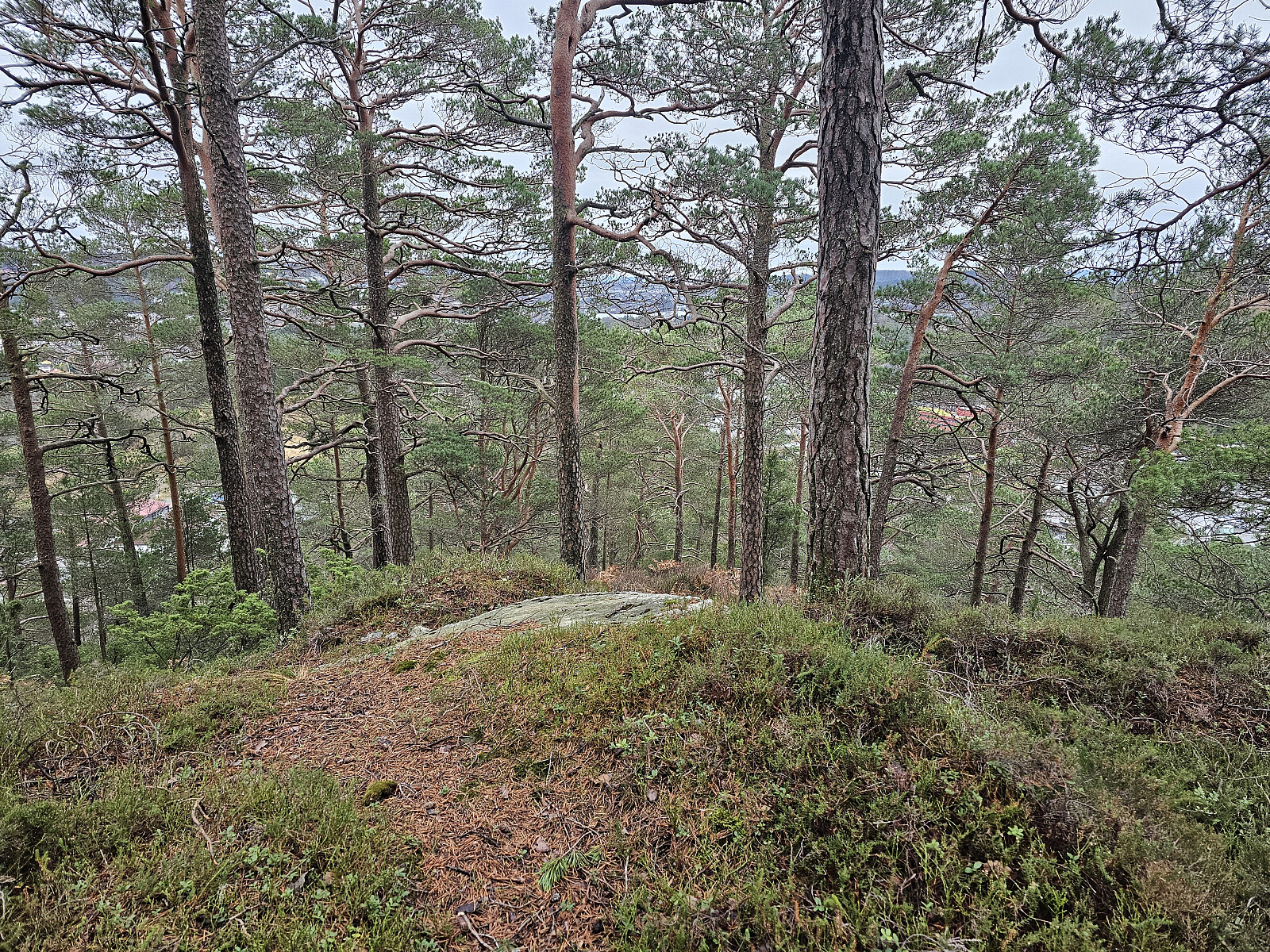 En anderledes fjelltur som kan anbefales. Tok sti fra hovedvei 100m. nord for rasteplassen der det er tur-skilt til Haugsvarden. Stien oppover gikk for det meste rett opp på polert fjell, tørt fjell i dag og det er å anbefale. Merket med røde vardesteiner og T merker på fjell, god sti ellers oppover. Oppe ved vann 373 ble det mer vegetasjon og stien gikk videre østover og for meg så det ut som den gikk ned til Unndal der det er bilvei. Jeg tok til høyre uten sti opp til toppen Skorpa som er en PB post uten registrert bestigning. På toppen er det åpen furuskog med mye blåbærlyng. Ingen sti på toppen og trolig en topp kun for hjorten. På vei ned ville jeg prøve å finne Haugsvarden som står på skilt ved start, ingen treff ved søk på Norgeskart. Fant kun stien som gikk videre >>>