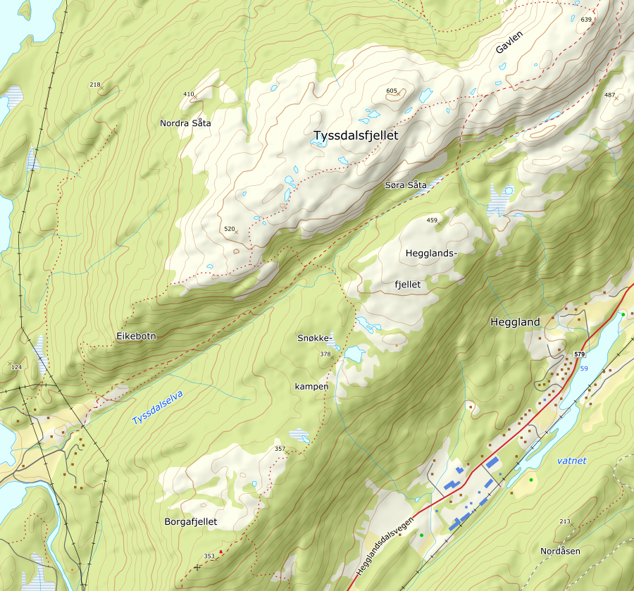 Jeg parkerte ved Tøsdalen parkering og gikk bortover grusveien langs Oselva til Knutabruo. Ved veien her gikk det merket sti opp til Borgafjellet. Den var til tider ganske bratt. På Borgafjellet var jeg også innom dagsturhytten Borgabuo. Gikk så sti nordøstover mot Hegglandsfjellet, så tilbake et stykke før jeg gikk oppover dalen mot Møsnuken. Ved stikrysset valgte jeg den letteste stien til toppen. På returen gikk jeg oppom Tyssdalsfjellet. Fulgte sti videre bort til Linken. Ned igjen valgte jeg å gå videre og stien som kom ned ved parkeringsplassen. Den var også veldig bratt. Heldigvis var det ganske tørt, men måtte allikevel være forsiktig.