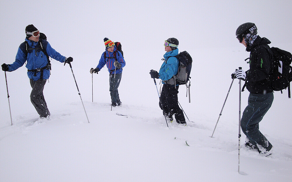 Min første topptur, med lånte ski, tunge Marker Dukes og korte slalomstaver. Kom oss ikke helt opp på Blæja pga. uvår. Etter en overnatting i lavvo, gikk turen til Fremste Blåhornet på dag 2.