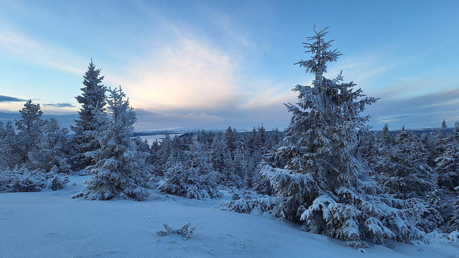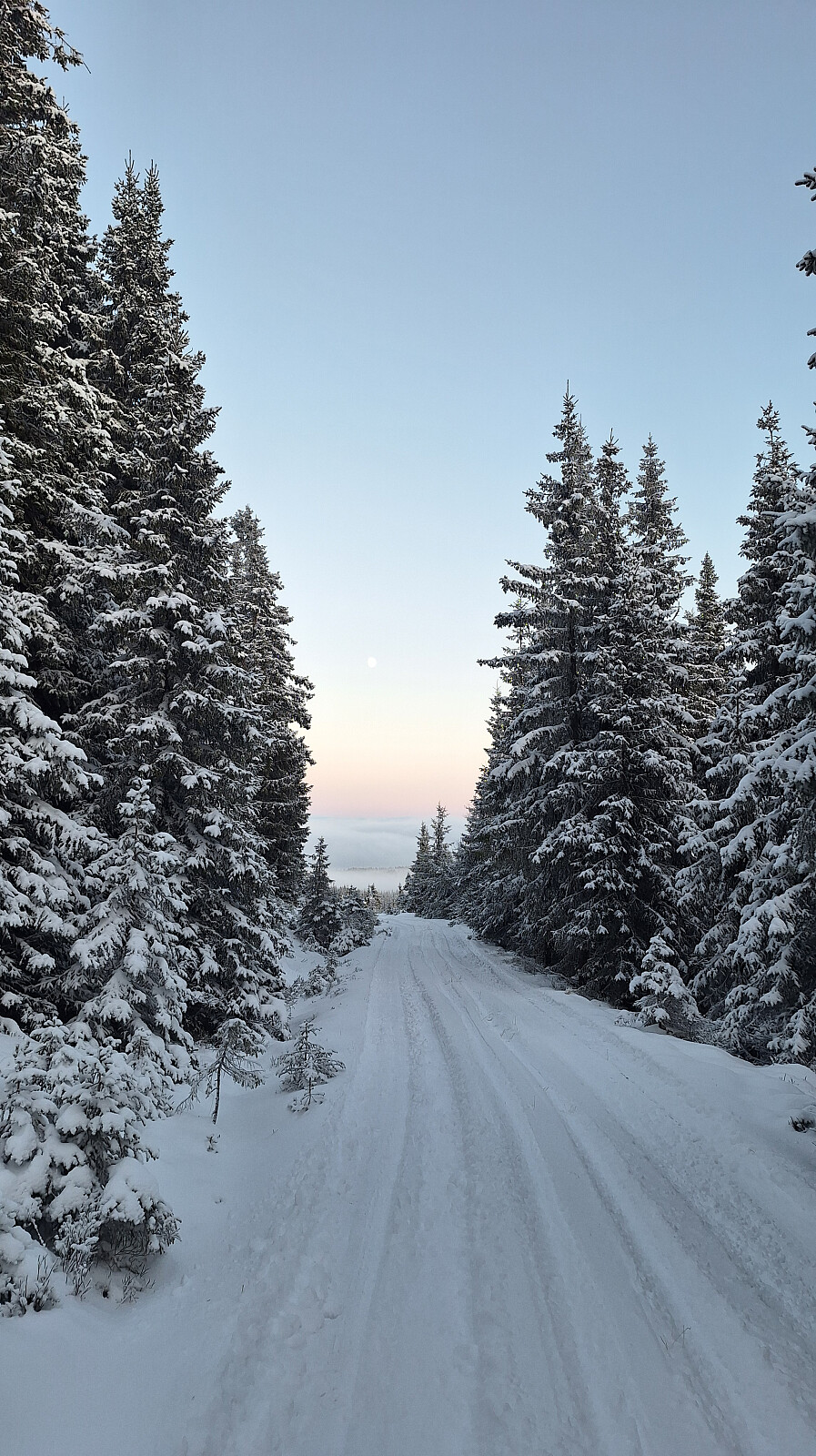 Ti grader kaldere over tåka på Vingromsåsen. Hadde regnet med å måtte vasse i nysnøen, men det hadde vært arbeidsfolk på toppen så det var bilspor helt opp.