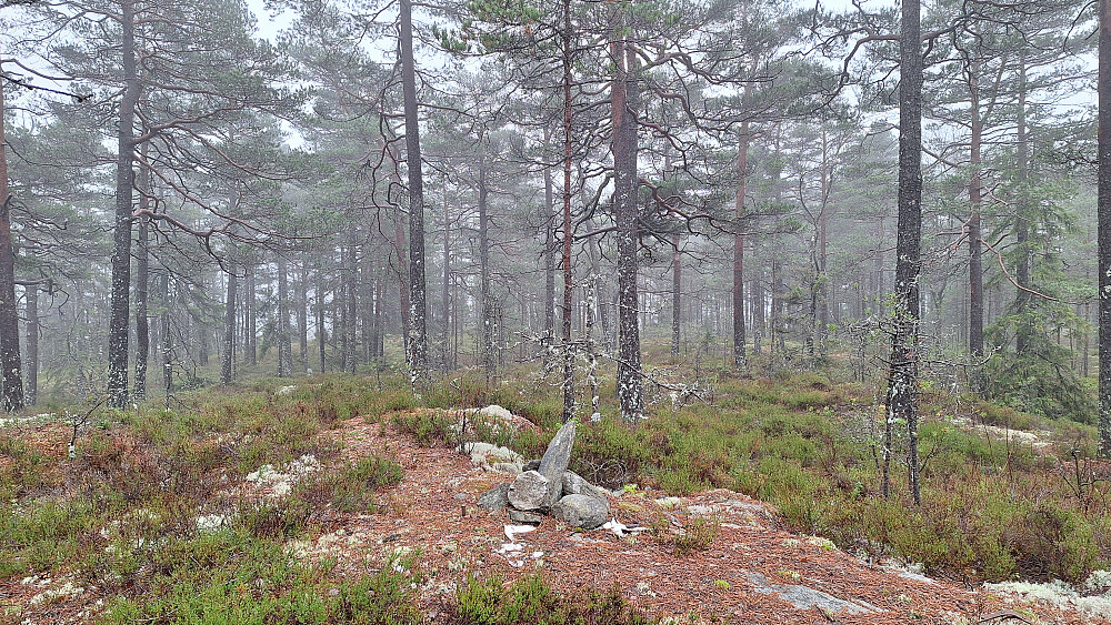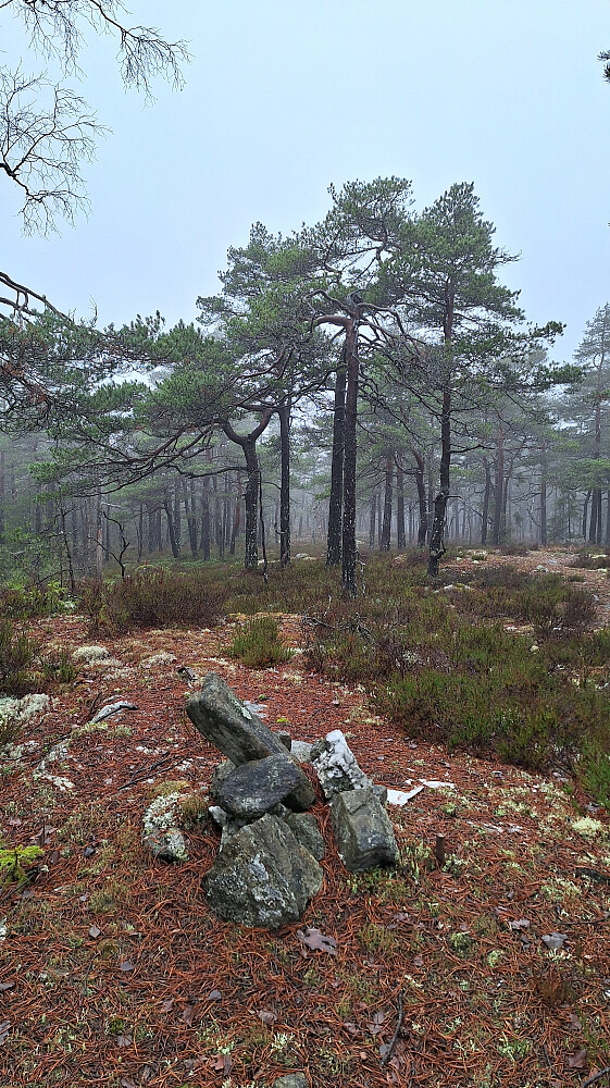 Kjørte rett gjennom gårdstunet på Bredholt og parkerte i neste veikryss. Fugte en sti til Horntjern og videre over hogstfelt med masse vannhull og balansekunst over glatte stokker og på lealause gresstuer. Siste par hundre meterne gikk gjennom flott furuskog. La returen litt vestover og unngikk vannbadet.