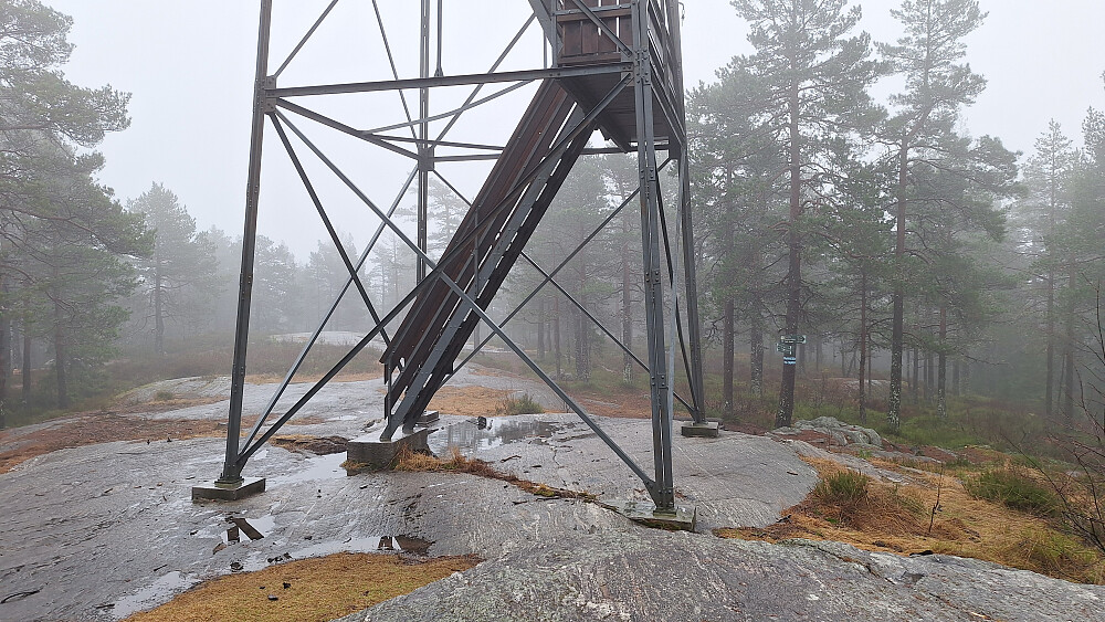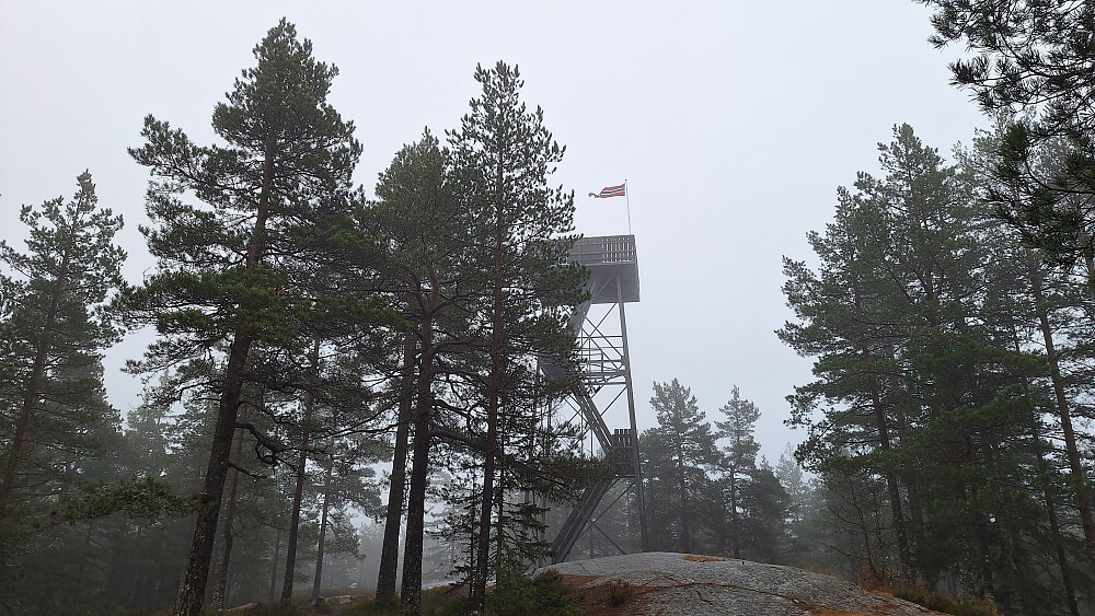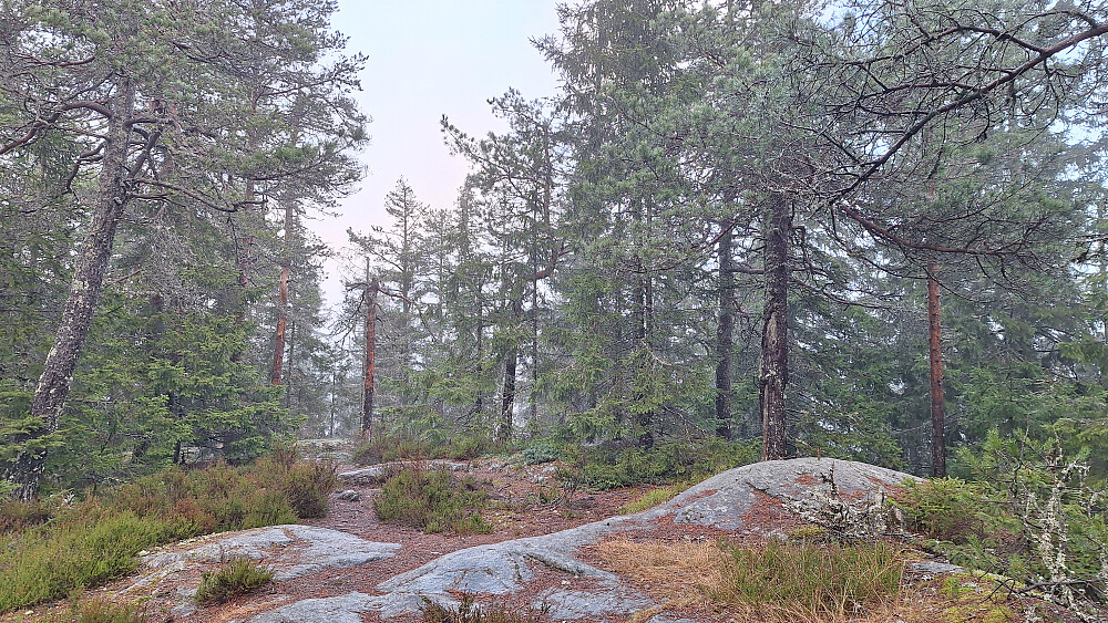 Ifølge yr skulle tåka lette utover dagen, og sola skulle til og med komme fram, men jeg fikk bare et hint før mørket kom. Ingen utsikt på Kjerringhøgda, og litt opplett på Tonekollen. Der blåste det durabelig på stupkanten. Fulgte sti og vei hele ruta og konsentrerte meg om å tråkke trygt blant vannpytter, sleipe steiner og røtter. Mange oversvømmelser underveis, men framkommelig.