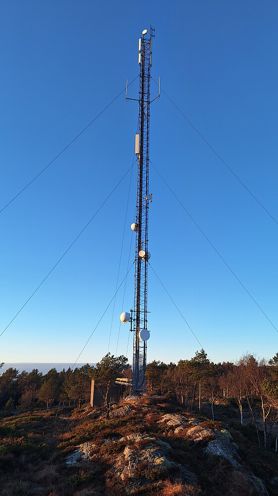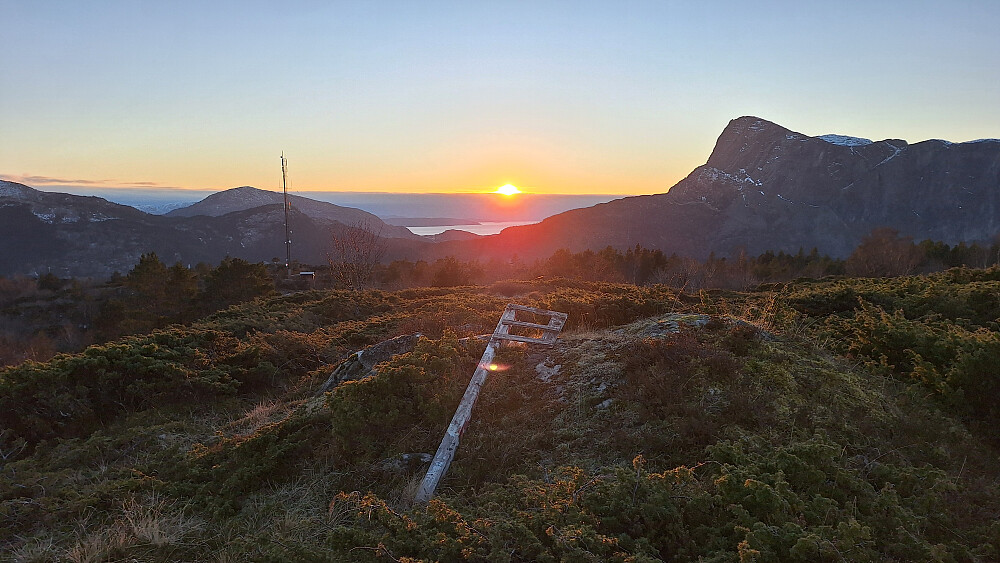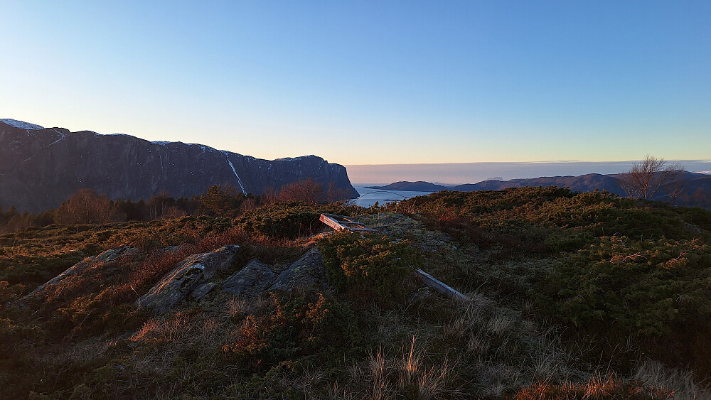 Parkerte på en plass langs veien der det lå lange tremaster. Ut fra traktorsporene å dømme er det nok mye aktivitet her, men satset på at ingen skulle jobbe på en søndagskveld like før solnedgang. Gikk på måfå opp gjennom hjorteskogen. Lettgått til det siste platået der bresken ble rådende. Fordel å gå myrene som var steinharde, og alt vannet stålis. Gikk via masta opp. Da det gjenstod 100 meter til toppen så jeg utover et hav av bresk og lurte på hvor jeg skulle gå. Ble stående og se på Hurtigruta en stund før jeg fant en slag trasé uten altfor mye motstand. Fabelaktig solnedgang, men det ble kaldt å stå i vinden, og jeg hadde heller ikke lykt med, så jeg måtte begi meg nedover igjen. Litt dårligere rutevalg på returen.