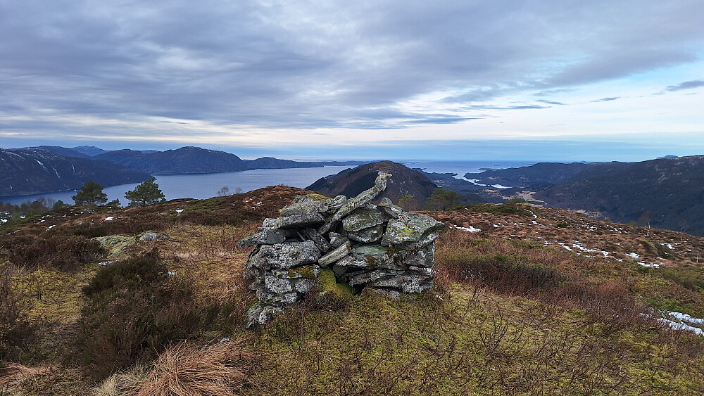Fulgte merket sti fra vanntårnet i Sørbøvåg. Stien var noe utydelig, så jeg måtte stoppe og sjekke flere steder hvor jeg skulle begi meg videre. Merkinga vekslet mellom gule/blasse og røde bånd på trærne og var heller ikke alltid lett å se. Siste kneika opp lauvskogen fikk jeg akutte brystsmerter, ble kvalm og kaldsvettet, men klarte å passere et snøparti før beina ga etter. Ble sittende lent mot ei velplassert bjørk, og heldigvis gikk det over uten at jeg besvimte. Tviler på at det var hjertet, mer sannsynlig lungene, så jeg valgte å fortsette. Litt slappfisk, men hadde bare 300 meter igjen til toppen, og det var ikke mange høydemetrene. Kald vind over tregrensa, så jeg gjorde fort vendereis. Ned igjen gikk det bare nedover, og kroppen håndterte det greit.