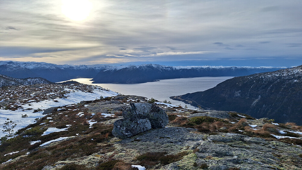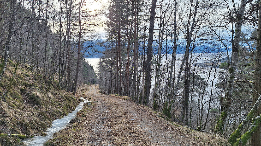 Jeg prøvde meg på en annen tur først i indre strøk, men det var langt fra ideelle forhold for truger. Over 400 moh. ble det mer snø med skare som delvis brast og sukkersnø under. Det ville blitt for tungt i min dårlige form å gå sånn i over halvannen mil. Gjorde derfor vendereis og kjørte ut til fjorden. Ved Klevald står man litt til hinder uansett hvor man setter bilen, så jeg parkerte på Klevaldsneset. Største utfordringen på turen ble grinda like etter at grusveien begynner opp lia. Grinda lot seg ikke åpne og var påbygd i høyden, men kom meg over ved å klatre via et stag og hoppe. Høye hjortegjerder overalt ellers. Fant et tempo som luftveiene tålte, og det var utrolig flott opp gjennom den høyreiste furuskogen. Vinden suste i tretoppene. Over ryggen var det delvis snø og tørre sva og lettgått. Kraftig vind over tregrensa.