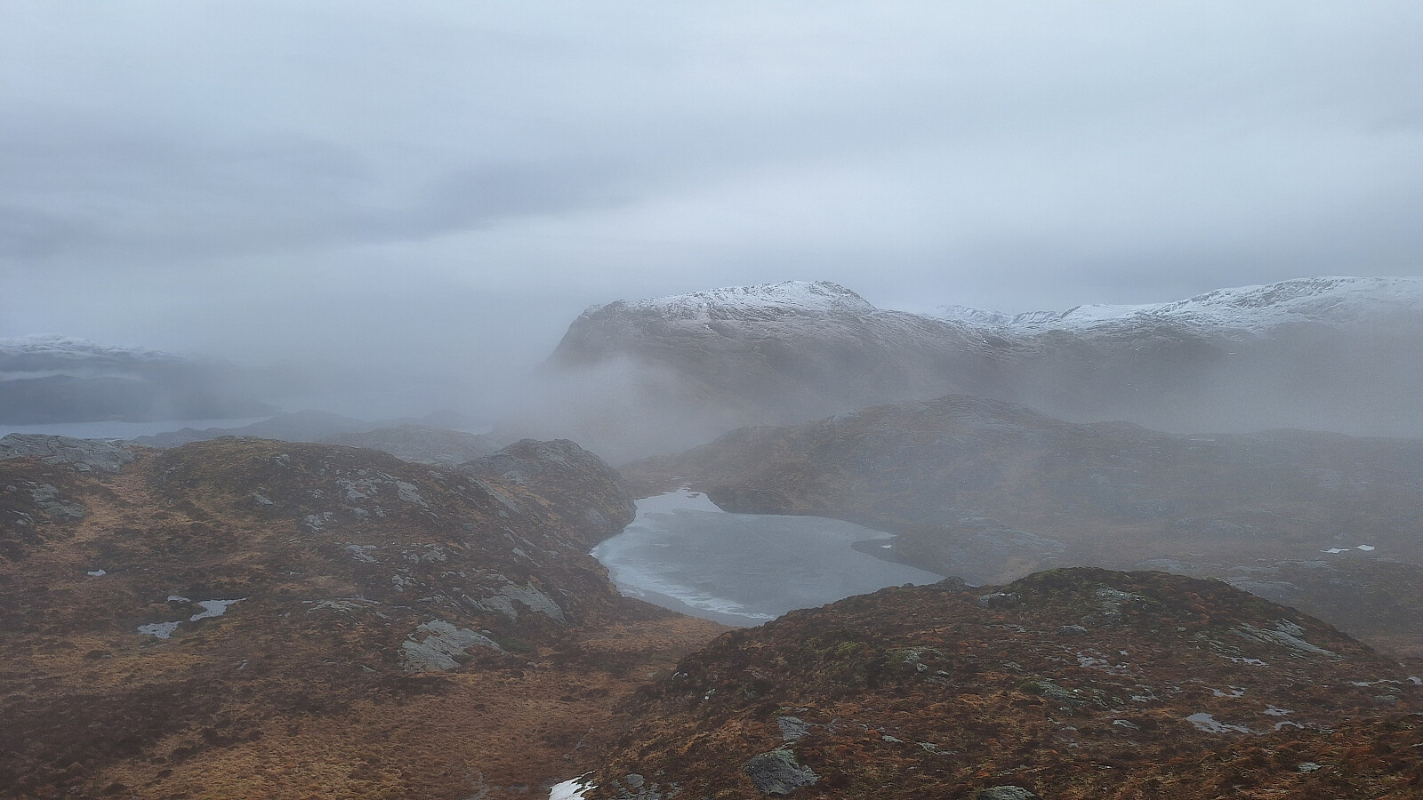 Mye nedbør i løpet av natta, og over ca. 300 moh. kom den som snø. Litt høyere snøgrense i ytre strøk, og det var svært vått, sleipt og glatte sva i dag. Ti grader kjøligere enn i går, men lite vind. Været ble mye bedre i løpet av turen, og jeg slapp etter hvert å gå på GPS.