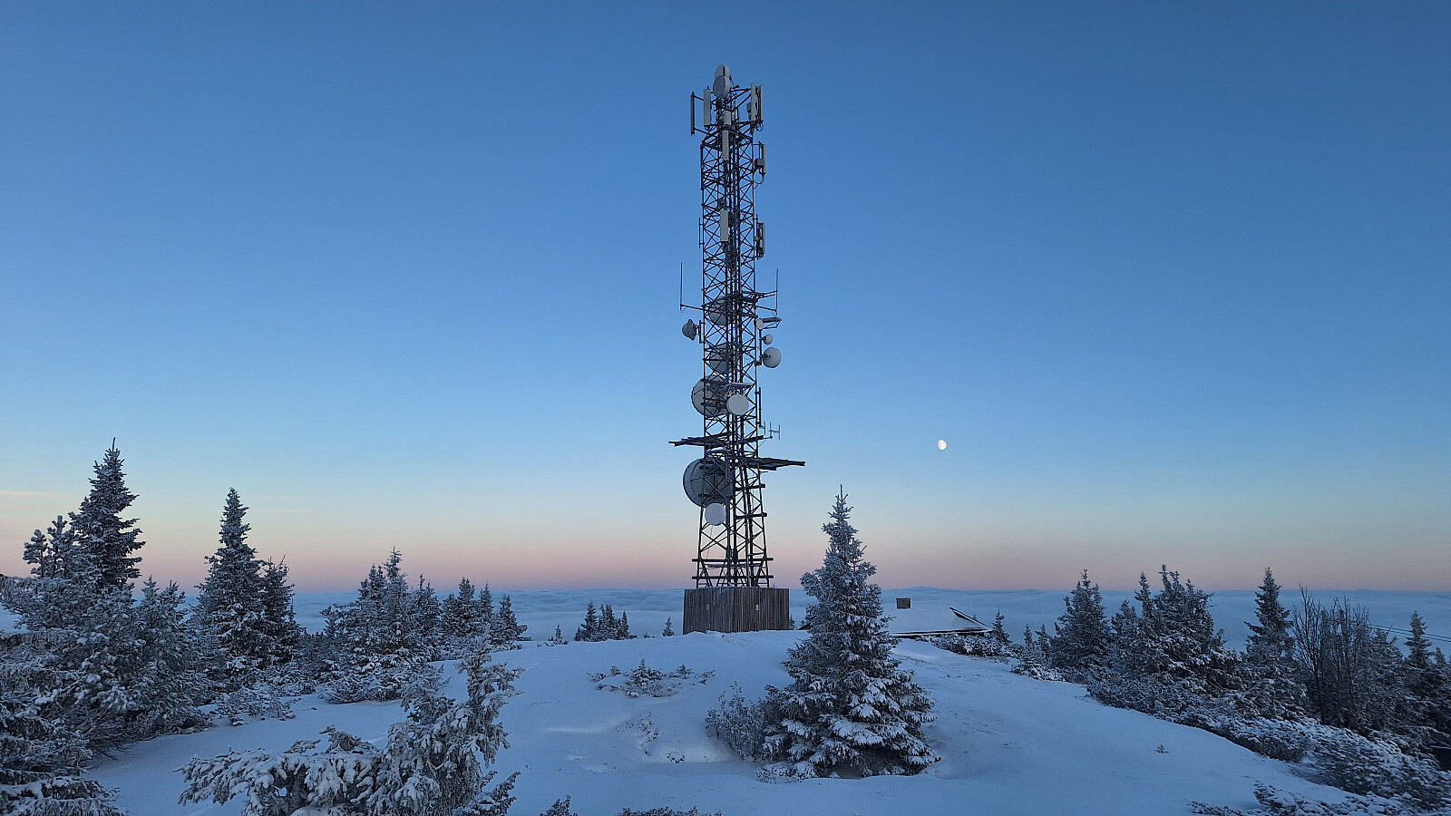 Ti grader kaldere over tåka på Vingromsåsen. Hadde regnet med å måtte vasse i nysnøen, men det hadde vært arbeidsfolk på toppen så det var bilspor helt opp.