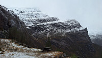 Parkerte ved ei hytte før grinda parallelt med Nørdre Olderøyna. Veien utover var ikke brøytet og tidvis svært isete og glatt. På avstand så snøforholdene på Fanneskarvarden greie ut, men det ble fort veldig mye snø oppover, ca. 20 cm fra 300 moh. Klarte å holde stien sånn noenlunde ved å følge blåmalte pinner. Til å begynne med var det våt snø og isen under var i oppløsning, og det ble temmelig fuktig. Tørrere snø i høyden med blankis under, men til gjengjeld dype fonner som måtte forseres, og da frøs bukse og sko. Siste stykket opp var det mer avblåst. Fikk en heftig snøbyge fra ca. 300 moh. som fulgte meg til topps, men akkurat da jeg skulle til å gå ned igjen, letnet det like brått som bygen kom. Spennende kystklima. Hadde tenkt gå en annen topp etterpå, men >>>