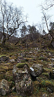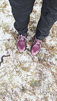 Denne turen frister ikke til gjentagelse, iallfall ikke under dagens forhold. Riktignok veldig fint opp gjennom furuskogen med plenty med hjortestier, men fra ca. 350 moh. begynte sleip snø, og jo høyere opp, jo verre, siden snømengden økte. Det var vanskelig å plassere føttene riktig og potensielt mange muligheter for å knerte føttene. Snøen skjulte glatte og løse steiner og lyng med luft under. Hustrig på toppen i regn og vind, men flott utsikt selv på en grå ettermiddag. Brukte god tid nedover det forræderske snøpartiet og datt bare en gang uten å slå meg.